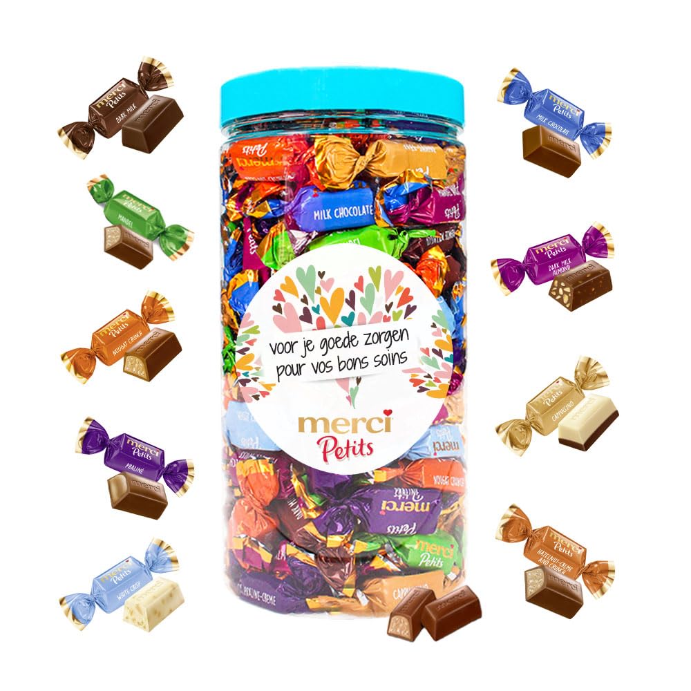 Discover the perfect chocolate gift to express your gratitude with this reusable jar filled with 700g of merci Petits chocolates. These little chocolates are available in several delicious flavors: cappuccino, almond, white crisp, milk chocolate, hazelnut cream and crisp, praline cream, and dark milk chocolate. merci is a brand renowned for its chocolate gifts, perfect for thanking someone or showing your appreciation. This chocolate gift is no exception, as it carries the message "merci voor je goede zorgen merci pour vos bons soins" (thank you for your good care). It's the ideal present to thank someone for their invaluable support in a delicious way. INGREDIENTS Ingredients: sugar, cocoa butter, whole MILK powder, cocoa mass, chopped ALMONDS (6.3 ), CREAM powder, vegetable fats (palm, shea), skimmed MILK powder, ground HAZELNUTS (1.6 ), LACTOSE, concentrated BUTTER, BUTTERMILK powder, WHEAT flour, dextrose, emulsifier: lecithins (SOYA), rice flour, coffee, fat-reduced cocoa, fructose, WHEAT protein, salt, flavorings, WHEAT malt. ALL VARIETIES MAY ALSO CONTAIN TRACES OF HAZELNUTS, ALMONDS, PEANUTS, OTHER (HARD) TREE NUTS AND WHEAT.merci Petits chocolats - "merci voor de goede zorgen merci pour vos bons soins" - 7 saveurs - cadeau chocolat - 700gDESCRIPTION DU PRODUIT DESCRIPTION DU PRODUIT Découvrez un cadeau chocolaté parfait pour exprimer votre gratitude avec ce bocal réutilisable rempli de 700g de chocolats merci Petits. Ces petits chocolats sont disponibles en plusieurs saveurs délicieuses: cappuccino, amande, croustillant blanc, chocolat au lait, crème et croustillant aux noisettes, crème pralinée, lait noir. merci est une marque reconnue pour ses cadeaux chocolatés, parfaits pour remercier quelqu'un ou lui montrer votre appréciation. Ce cadeau chocolaté ne fait pas exception, car il porte le message "merci voor je goede zorgen merci pour vos bons soins". C'est le présent idéal pour remercier quelqu'un de son soutien précieux de manière délicieuse. INGRÉDIENTS Ingrédients: sucre, beurre de cacao, LAIT entier en poudre, pâte de cacao, AMANDES hachées (6,3 ), CRÈME en poudre, graisses végétales (palme, karité), LAIT écrémé en poudre, NOISETTES moulues (1,6 ), LACTOSE, BEURRE concentré, BABEURRE en poudre, farine de FROMENT, dextrose, émulsifiant: lécithines (SOJA), farine de riz, café, cacao maigre, fructose, protéines de BLÉ, sel, arômes, malt de FROMENT. TOUTES LES VARIÉTÉS PEUVENT AUSSI CONTENIR DES TRACES DE NOISETTES, D'AMANDES, D'ARACHIDES, D'AUTRES FRUITS À COQUES (DURES) ET DE BLÉ.