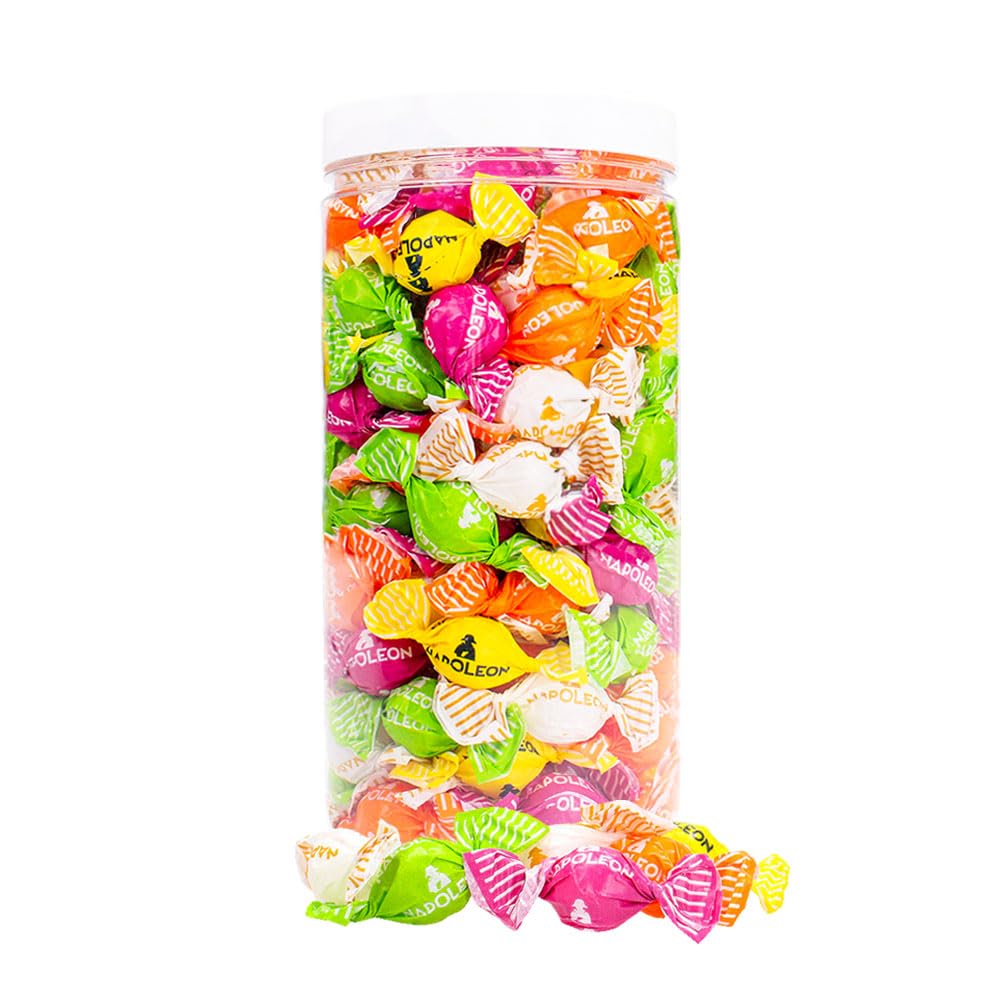 Discover a reusable jar filled with 750g of Napoleon candies, the famous hard candies with fruity flavors and a tangy center. These candies offer a unique experience: you have to suck on them for a moment before discovering the tangy surprise inside. Available in five different flavors – lemon, apple, orange, cherry, and pineapple – these candies deliver unparalleled freshness with a surprising twist.