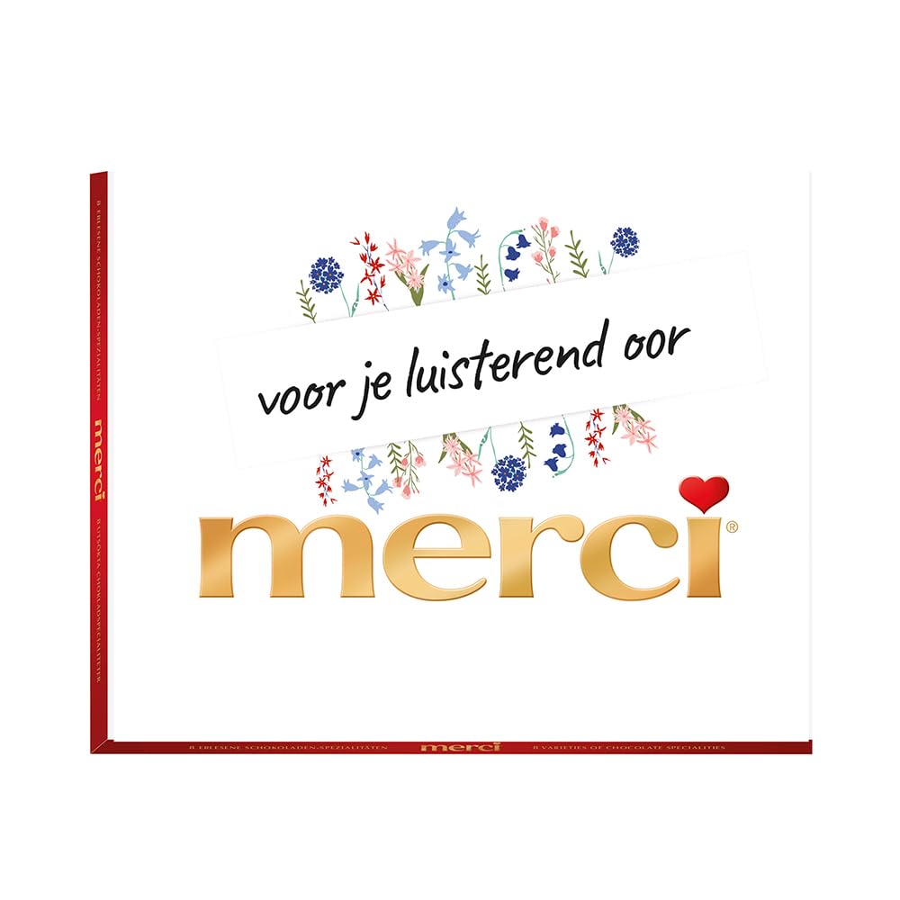 DESCRIPTION DU PRODUIT Exprimez votre gratitude avec ce cadeau chocolaté merci pour remercier quelqu'un de son soutien et de son écoute. Ce coffret contient 250g de tablettes de chocolat Merci Finest Selection, avec 8 délicieuses saveurs: chocolat au lait, crème moka, amande-noisette, praliné noisette, massepain, chocolat noir, mousse au chocolat noir et praliné au lait. Ce cadeau chocolat est joliment emballé avec le message "merci voor je luisterend oor", idéal pour exprimer votre gratitude à une personne qui vous a écouté et soutenu.