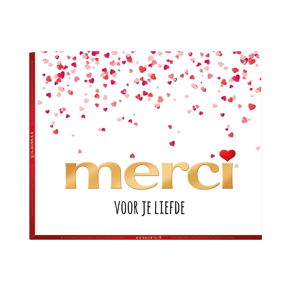Express your love with a delicious chocolate gift from Merci. This box contains 250g of chocolate bars from the Merci Finest Selection collection, available in 8 different flavors: milk chocolate, mocha cream, almond-hazelnut, hazelnut praline, marzipan, dark chocolate, dark chocolate mousse, and milk praline. The gift comes in beautifully designed packaging with the message "thank you for your love," perfect for surprising your partner on Valentine's Day or just because. INGREDIENTS Ingredients: sugar, cocoa butter, whole milk powder, cocoa mass, cream powder, chopped almonds (4.3 ), vegetable fats (palm, shea), skimmed milk powder, ground hazelnuts (1.8 ), lactose, concentrated butter, buttermilk powder, dextrose, wheat flour, rice flour, emulsifier: lecithins (soy), coffee, fat-reduced cocoa powder, fructose, wheat protein, salt, flavorings, wheat malt. Cocoa: 32 minimum in whole milk chocolate, Cocoa: 32 minimum in cream chocolate, Cocoa: 45 minimum in whole milk dark chocolate. The proportions of the ingredients may vary slightly depending on the production.merci Finest Selection Assorted bonbons de chocolat "merci voor je liefde" - 8 saveurs de chocolat - cadeau en chocolat - mélange de chocolats - 250gDESCRIPTION DU PRODUIT DESCRIPTION DU PRODUIT Exprimez votre amour avec un délicieux cadeau chocolaté de la marque merci. Ce coffret contient 250g de tablettes de chocolat de la collection Merci Finest Selection, disponible en 8 saveurs différentes: chocolat au lait, crème moka, amande-noisette, praliné noisette, massepain, chocolat noir, mousse au chocolat noir et praliné au lait. Le cadeau est présenté dans un emballage joliment conçu avec le message "merci pour ton amour", parfait pour surprendre votre partenaire à la Saint-Valentin ou juste pour le plaisir. INGRÉDIENTS Ingrédients: sucre, beurre de cacao, lait entier en poudre, pâte de cacao, crème en poudre, amandes hachées (4,3 ), graisses végétales (palme, karité), lait écrémé en poudre, noisettes moulues (1,8 ), lactose, beurre concentré, babeurre en poudre, dextrose, farine de froment, farine de riz, émulsifiant: lécithines (soja), café, cacao maigre, fructose, protéines de blé, sel, arômes, malt de froment. Cacao: 32 minimum dans le chocolat au lait entier, Cacao: 32 minimum dans le chocolat à la crème, Cacao: 45 minimum dans le chocolat noir au lait entier. Les proportions de la composition peuvent varier légèrement selon la production.