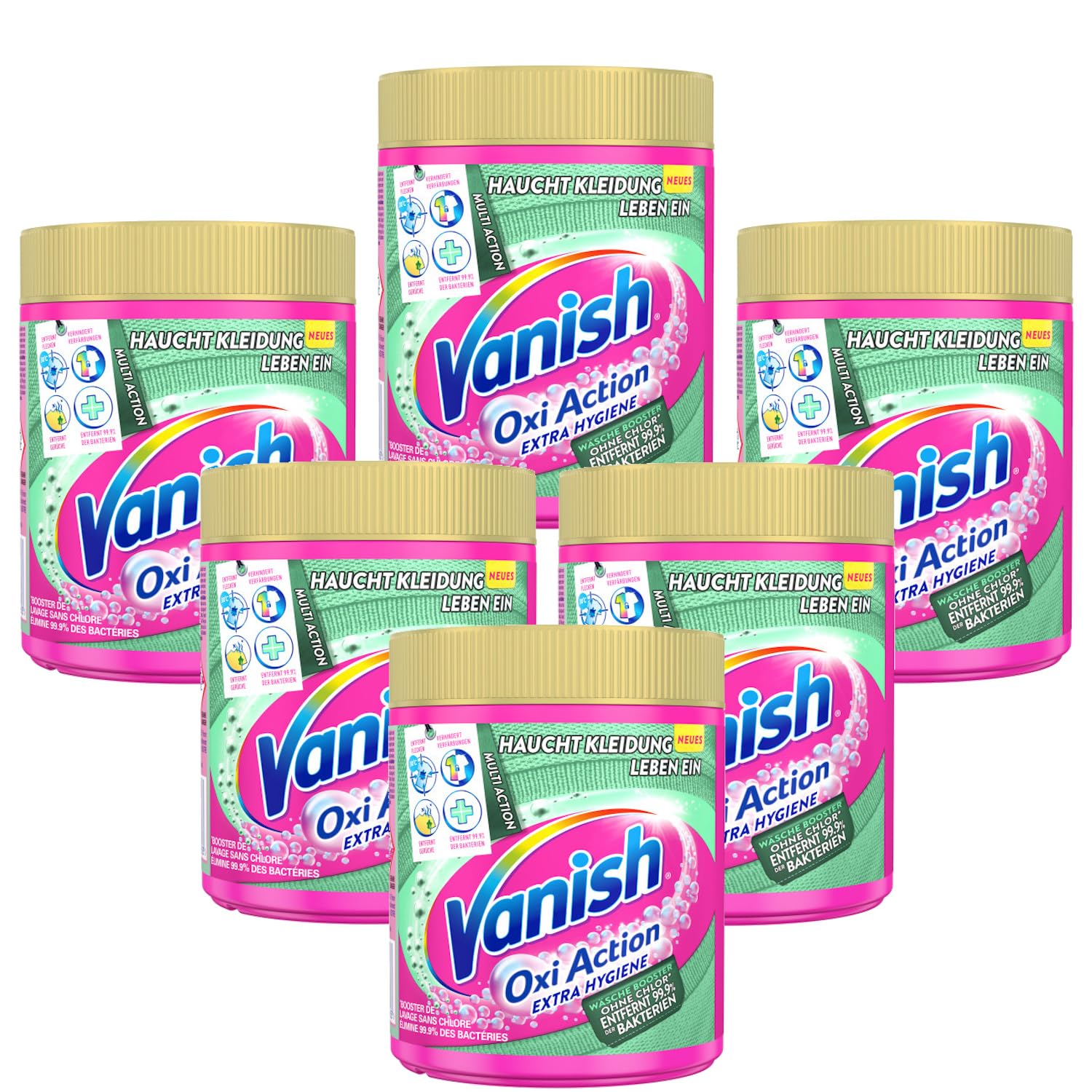 delivery scope 6 x 550 gr. Vanish extra hygiene oxi action powder.For hygienically pure laundry.Provide and soak for speed and effectiveness.Put the detergent in the main wash: 1 dosing spoon for stubborn spots, 1 2 dosing spoons for normal spots.Suitable for both colorful and white clothing.Vanish Extra Hygiene not only removes stains on the first wash, but also eliminates 99.9 of the bakeria, as well as bad smells.