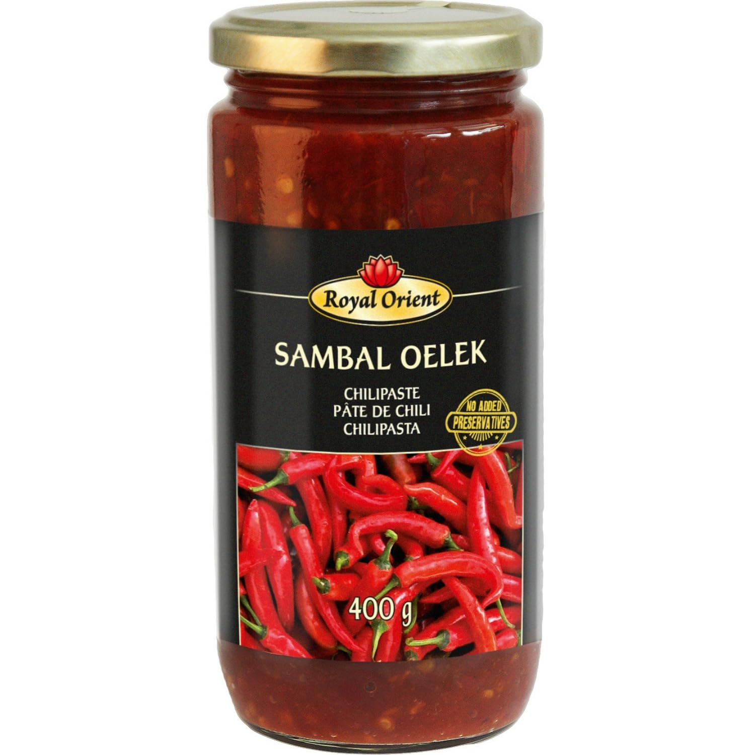 Royal Orient Sambal Oelek Chili Paste is distinctive and has a spicy taste that enriches every meal. You can add it to anything you like to spice up the taste of food - perfect for seasoning soups and sauces. An excellent substitute for fresh chili peppers. It is suitable for seasoning a wide range of spicy dishes. Comes in 6 packs or 400g each.Royal Orient Sambal Oelek Spaanse Peper Plakken 6 Pakken van 400 g Royal Orient Sambal Oelek Spaanse Peper Plakken is onderscheidend en heeft een pittige smaak verrijkt elke maaltijd. Je kunt het toevoegen aan alles wat je maar wilt om de smaak van eten op smaak te brengen - perfect voor het kruiden van soepen en sauzen. Een uitstekende vervanger voor verse chilipepers. Het is geschikt voor het op smaak brengen van een breed scala aan pittige gerechten. Komt in 6-inpakken of 400 g elk.