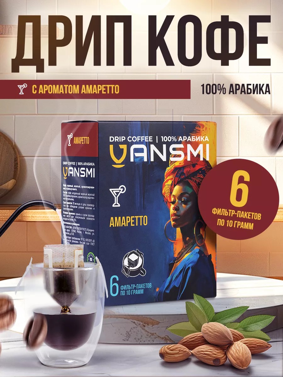 VANSMI Дрип кофе молотый Амаретто 6шт 100% Арабика