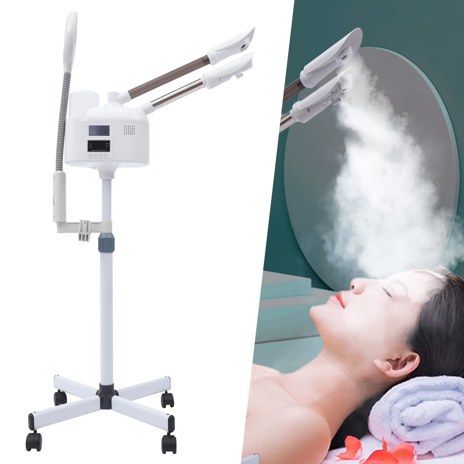 Safe and stable: The facial steamer has four wheels and a stable frame with crossed feet to prevent it from tipping over easily. When the unit is out of water, it automatically shuts off to protect both the user and the device. Adjustable height and angle: The hot and cold nozzles can be rotated independently through 360 and 270 , and the overall height can be adjusted from 33.5 to 47.6 inches, allowing you to choose between sitting or lying down for a comfortable facial treatment. LED light and magnifying glass: The soft LED light source and built-in magnifying glass help the esthetician more accurately assess the client's skin condition and provide targeted treatments. The cool light can be rotated 360 to accommodate a variety of lighting needs. Smart touchscreen: This facial steamer features a clear display and convenient touch buttons. You can clearly see the device's operating status on the screen, and the flexible controls make it even more convenient to use. PTC heating technology: With enhanced PTC heating technology, you can spray and care for your skin even more gently. Thanks to the innovative PTC heating technology, you can say goodbye to limescale buildup and no longer have to worry about cleaning the device.