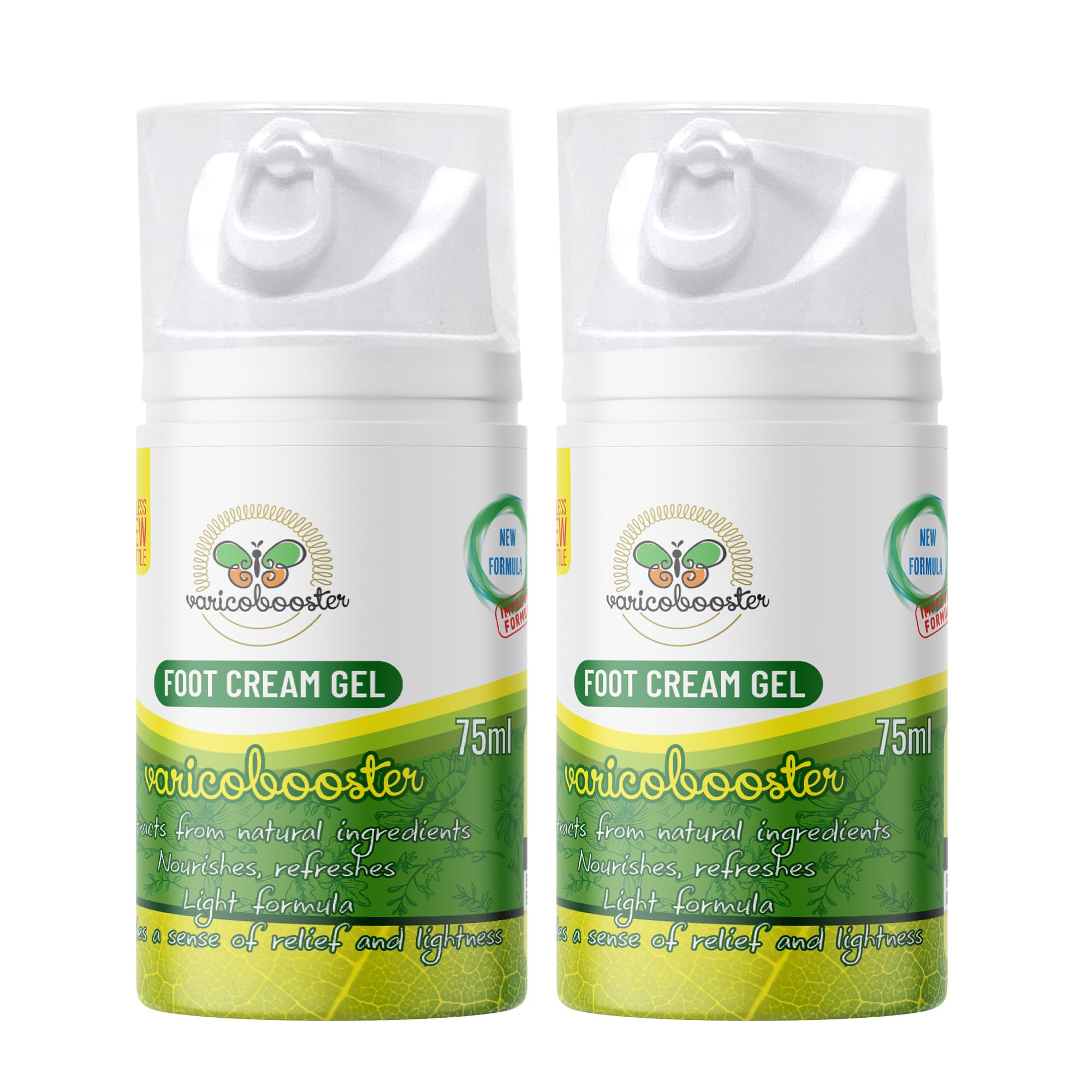 Varicobooster: Cosmetic Leg Cream Discover Varicobooster cream, a product that will delight all lovers of natural skincare. This vegan cream, containing over 25 carefully selected ingredients, has been specially designed for your legs, giving you the confidence of choosing a high-quality product. Based on customer feedback, we have created a formula that combines the best natural components to meet your needs. New Airless Pump: Our innovative airless pump design ensures that the cream does not come into contact with air, guaranteeing its freshness and effectiveness with every use. You will always be able to recognize genuine Varicobooster leg cream thanks to this revolutionary technology. Applying the Leg Cream: To enjoy all the benefits, wash your hands thoroughly before and after use. Apply the cream generously to the skin of your legs and spread it evenly. The recommended massage time is up to 5 minutes to ensure complete absorption into the skin. The cream can be used up to 5 times a day to keep your legs soft and radiant. Leg cream quality: Each batch of Varicobooster undergoes rigorous quality control and meets EU cosmetic standards, so you can be sure you are using a safe and effective product. Choose Varicobooster and feel the difference! Incorporate Varicobooster into your daily beauty routine and enjoy skincare that aligns with your values. Treat yourself and the environment by choosing Varicobooster, a vegan product that cares for your legs. SAFETY WARNING - Wash your hands after each use. - Avoid contact with eyes. - Do not apply to irritated or broken skin. - Keep out of reach of children. - If irritation occurs, discontinue use and consult a doctor.Varicobooster Universal Care is suitable for everyone, regardless of gender, offering effective leg care. Quality Control: Each batch is tested and meets EU cosmetic standards. New Airless Pump: Prevents the cream from coming into contact with air, ensuring its longevity and effectiveness. Formula with over 25 ingredients: This leg cream is based on customer feedback and contains natural components. Part of your beauty routine: Varicobooster leg cream is ideal for those who prefer natural and vegan ingredients.VARICOBOOSTER Gel-Crème pour les pieds 2 x 75 ml, plus de 25 ingrédients soigneusement sélectionnés, nouvelle formule améliorée à base de composants naturels, Nova Botea Airless-PumpeDESCRIPTION DU PRODUIT DESCRIPTION DU PRODUIT Varicobooster: Crème cosmétique pour les jambes Découvrez la crème Varicobooster, un produit qui ravira tous les amateurs de soins naturels. Cette crème végétalienne, contenant plus de 25 ingrédients soigneusement sélectionnés, a été spécialement conçue pour vos jambes, vous donnant la confiance de choisir un produit de haute qualité. Sur la base des commentaires de nos clients, nous avons créé une formule qui combine les meilleurs composants naturels pour répondre à vos besoins. Nouvelle pompe Airless : notre design innovant de pompe Airless garantit que la crème n'entre pas en contact avec l'air, garantissant sa fraîcheur et son efficacité à chaque utilisation. Vous pourrez toujours reconnaître la véritable crème pour les jambes Varicobooster grâce à cette technologie révolutionnaire. Application de la crème pour les jambes : pour profiter de tous les bienfaits, lavez soigneusement vos mains avant et après utilisation. Appliquez la crème généreusement sur la peau des jambes et répartissez-la uniformément. Le temps de massage recommandé est jusqu'à 5 minutes pour assurer une absorption complète dans la peau. La crème peut être utilisée jusqu'à 5 fois par jour pour garder vos jambes douces et radieuses. Qualité de la crème pour les jambes : chaque lot Varicobooster passe par un contrôle de qualité rigoureux et répond aux normes cosmétiques de l'UE, vous pouvez donc être sûr que vous utilisez un produit sûr et efficace. Choisissez Varicobooster et sentez la différence ! Intégrez Varicobooster dans votre routine quotidienne de beauté et profitez d'un soin qui respecte vos valeurs. Faites-vous plaisir et faites plaisir à la nature en choisissant Varicobooster, un produit végétalien qui prend soin de vos jambes. AVERTISSEMENT DE SÉCURITÉ - Lavez-vous les mains après chaque utilisation. - Évitez tout contact avec les yeux. - Ne pas appliquer sur une peau irritée ou blessée. - Tenir hors de portée des enfants. - En cas d'irritation, arrêtez l'utilisation et consultez un médecin.Soin universel Varicobooster convient à tous, quel que soit le sexe, offrant des soins efficaces pour les jambes. Contrôle qualité Chaque lot est contrôlé et répond aux normes cosmétiques de l'UE. Nouvelle pompe Airless : empêche le contact de la crème avec l'air, ce qui garantit sa durabilité et son efficacité. Formule avec plus de 25 ingrédients : La crème cosmétique pour les jambes est basée sur les commentaires des clients et contient des composants naturels. Une partie de votre routine beauté : La crème pour les jambes Varicobooster est idéale pour les amateurs d'ingrédients naturels et végétaliens.