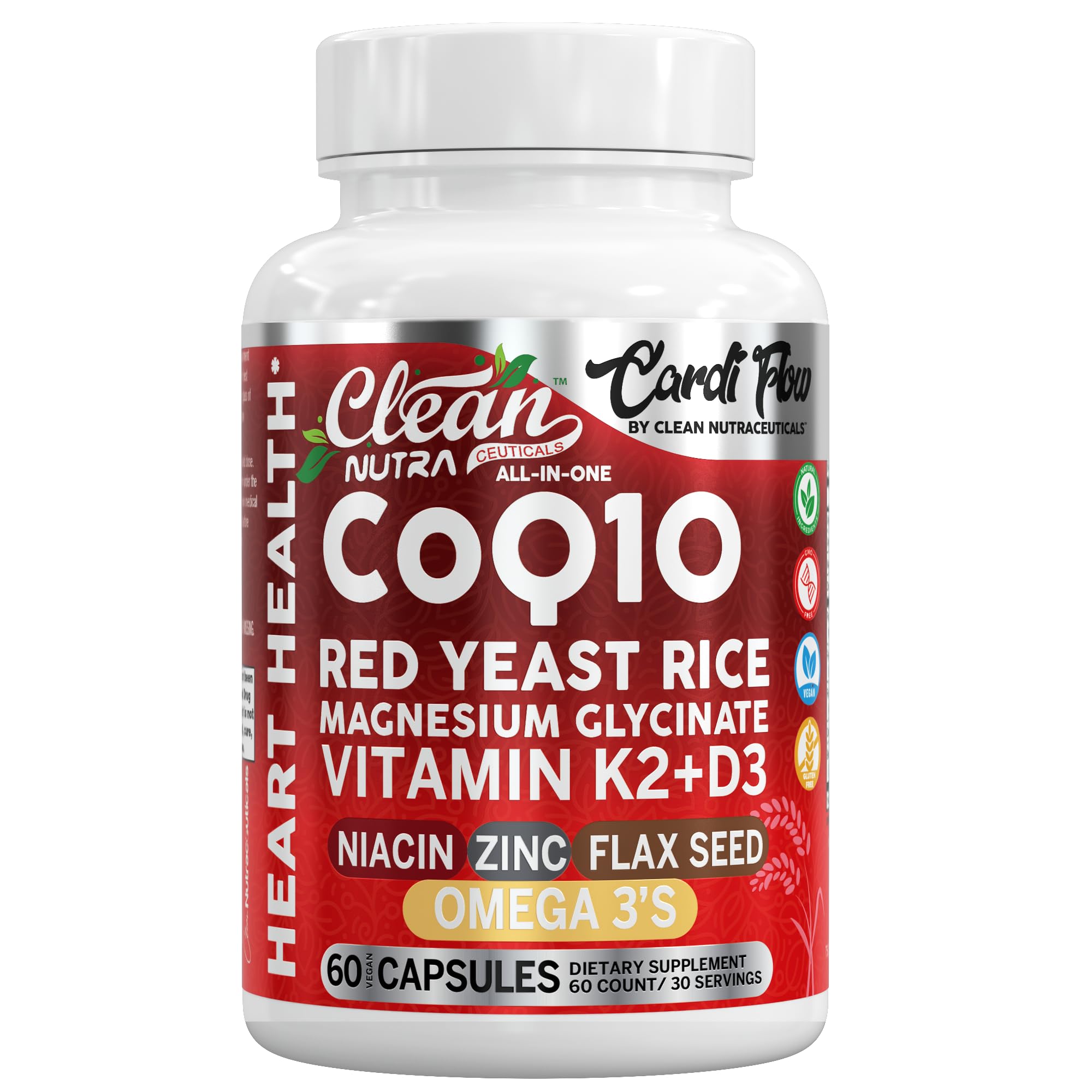 Clean Nutraceuticals Cardio Flow packs comprehensive care into a sleek 60 capsules engineered for everyday vitality. One veggie capsule unites magnesium complex for women and men, fish oil omega 3 supplements, zinc, coq10 100mg, d3 k2 vitamin 10000 iu, red yeast rice 600 mg, flaxseed ground and niacin, forming an advanced matrix that helps your thrive while supporting total-body wellness. Red yeast rice supplement with omega 3 supplement for women and men delivers defense, while coenzyme q10 powers energy for active lifestyles. Zinc supplements for men and women with vitamin k and omega3 round out lipid metabolism and nutrient conversion so you can greet every workout, deadline or family hike with consistent stamina. To promote natural circulation, we add black pepper with vitamin d3 k2 supplements to standardize absorption, creating a stack that rivals dedicated nitric oxide supplements for men and women without messy powders or sugar. With just two capsules daily, Clean Nutraceuticals delivers red yeast rice powder, flax seed oil and more in a single, space-saving bottle—simplifying your routine while and fuel your life.CoQ10 Ubiquinol : Vascular support supplement expertly formulated with vitamin d3 5000 iu to promote healthy circulation, k2 vitamin supplement to support calcium balance and arterial flexibility, and niacin with flax seeds organic to help with metabolism. Its potent blend includes zinc citrate and zinc gluconate for immune health, plus magnesium glycinate powder for relaxation and proper muscle function. Magnesium Glycinate : Merge high-potency d3 and k2 supplements, flaxseed oil capsules, red yeast rice 1200 mg, omega 3 fish oil, and magnesium oxide 400mg to deliver comprehensive circulation reinforcement in one easy serving. Support of magnesium citrate and zinc citrate calms muscles, sustained energy, and vibrant mood while replacing cluttered vitamin cabinets or mineral supplements with a single convenient capsule solution made for busy professionals and active lifestyles. Vitamin D3 K2 : Our formulation begins with coq 10 and magnesium oxide to relax vessels and maintain steady rhythm. K2 D3 vitamin supplement, niacin 500mg, and flaxseed oil, all elevated with black pepper. This powerhouse fosters healthy nitric oxide flow, balanced lipids, and smooth arterial flow without messy magnesium oil sprays or liquids. Fuel intense workouts, recovery nights, and demanding days with just two vegan capsules — no aftertaste, no compromises. Red Yeast Rice With CoQ10 : Our all-in-one formula unites red rice yeast with coq10, ground flaxseed, and a balanced magnesium complex to replace a cluttered shelf of co q 10 supplement softgels, magnesium glycinate gummies, and fish oil 1200 mg liquids. Two plant-based vitamin d3 k2 magnesium capsules with magnesium glycinate 400mg do the work of multiple bottles, delivering streamlined support without sugary gummies or messy oils. CoQ10 Supplement : Research-backed magnesium supplement, omega 3 supplements, zinc supplements, and flaxseed into just two easy capsules, giving comprehensive support without juggling separate bottles. Each serving delivers magnesium glycinate capsules and vitamin d k2 for muscle relaxation, red yeast rice capsules for absorption, omega 3 fatty acid supplements, plus zinc 50mg for vascular flow and vitality.