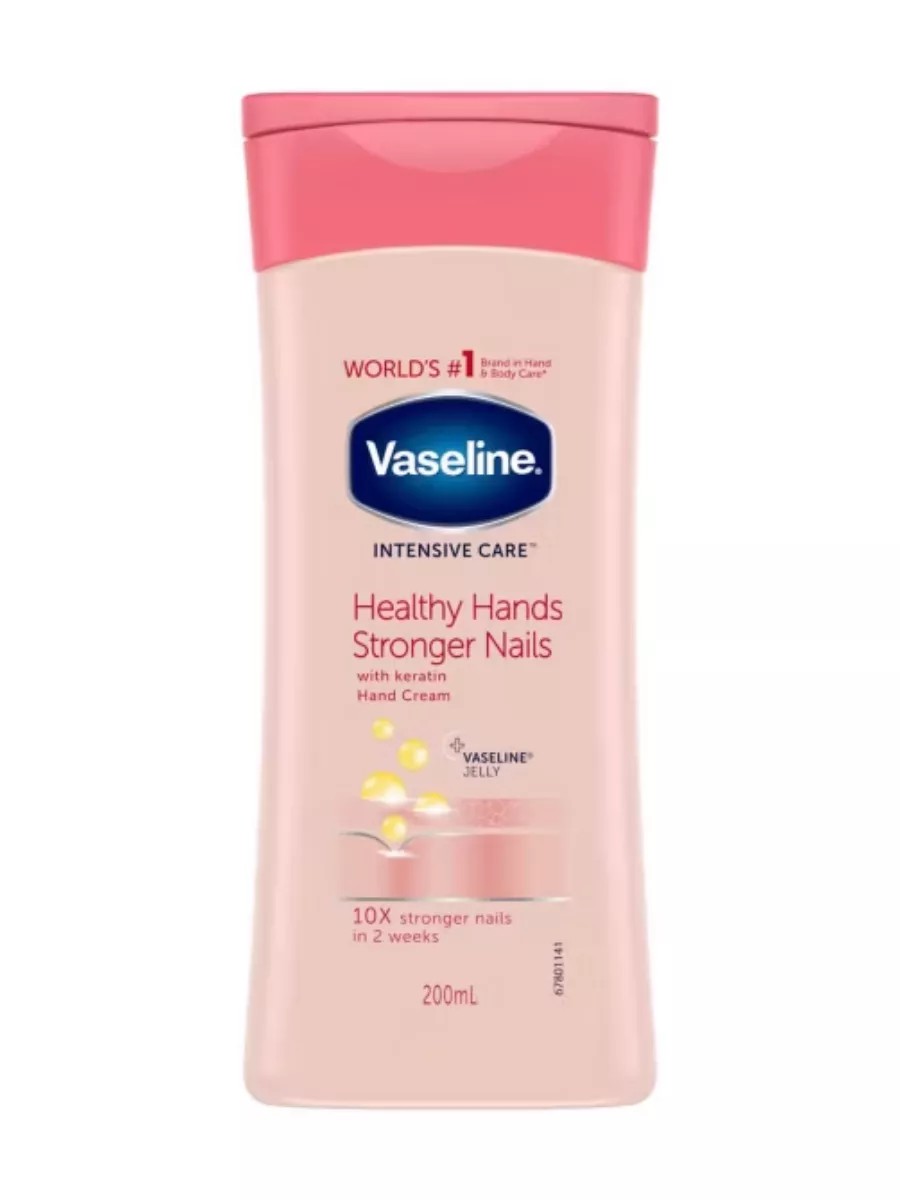 Specially developed Vaseline Healthy Hands Stronger Nails helps restore moisture levels to the skin thanks to its unique keratin formula and microdroplets of triple-purified petroleum jelly.
