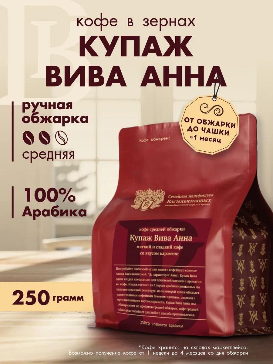 Купаж Вива Анна мы обжариваем по профилю средней обжарки, кофе средней обжарки подойдет для любого способа приготовления:будь то кофемашина, турка или гейзерная кофеварка, вы получите идеальный напиток в любое время дня.