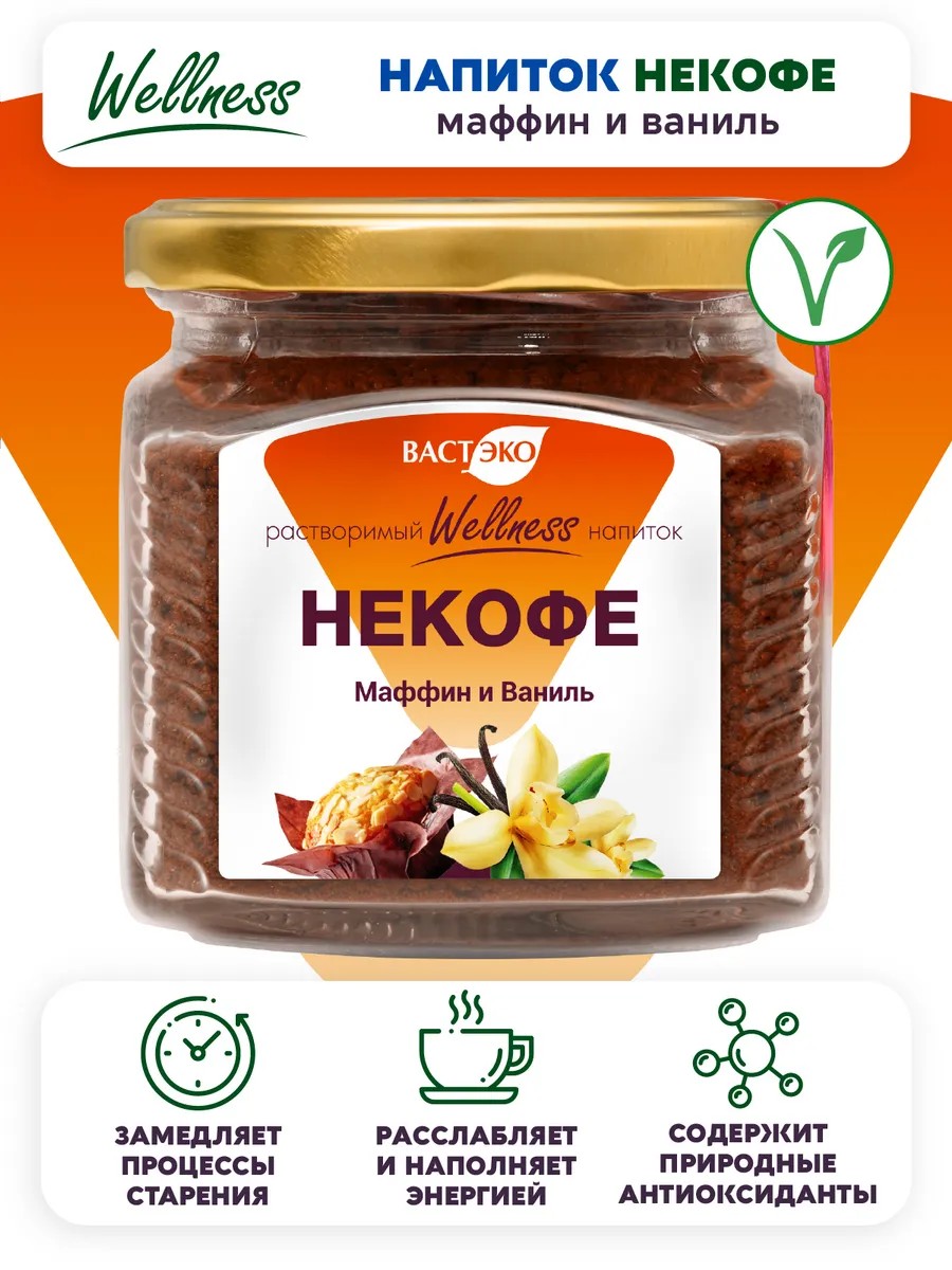НЕКОФЕ Маффин и Ваниль – растворимый напиток без кофеина, сахара, лактозы и глютена. Для всех, кто хочет уменьшить зависимость от кофеина. Напиток НЕКОФЕ может стать первым шагом к снижению потребления кофе. Он бодрит и согревает, при этом лишен негативных последствий, присущих кофе. Обладает тонизирующими свойствами, способствует укреплению иммунитета.
