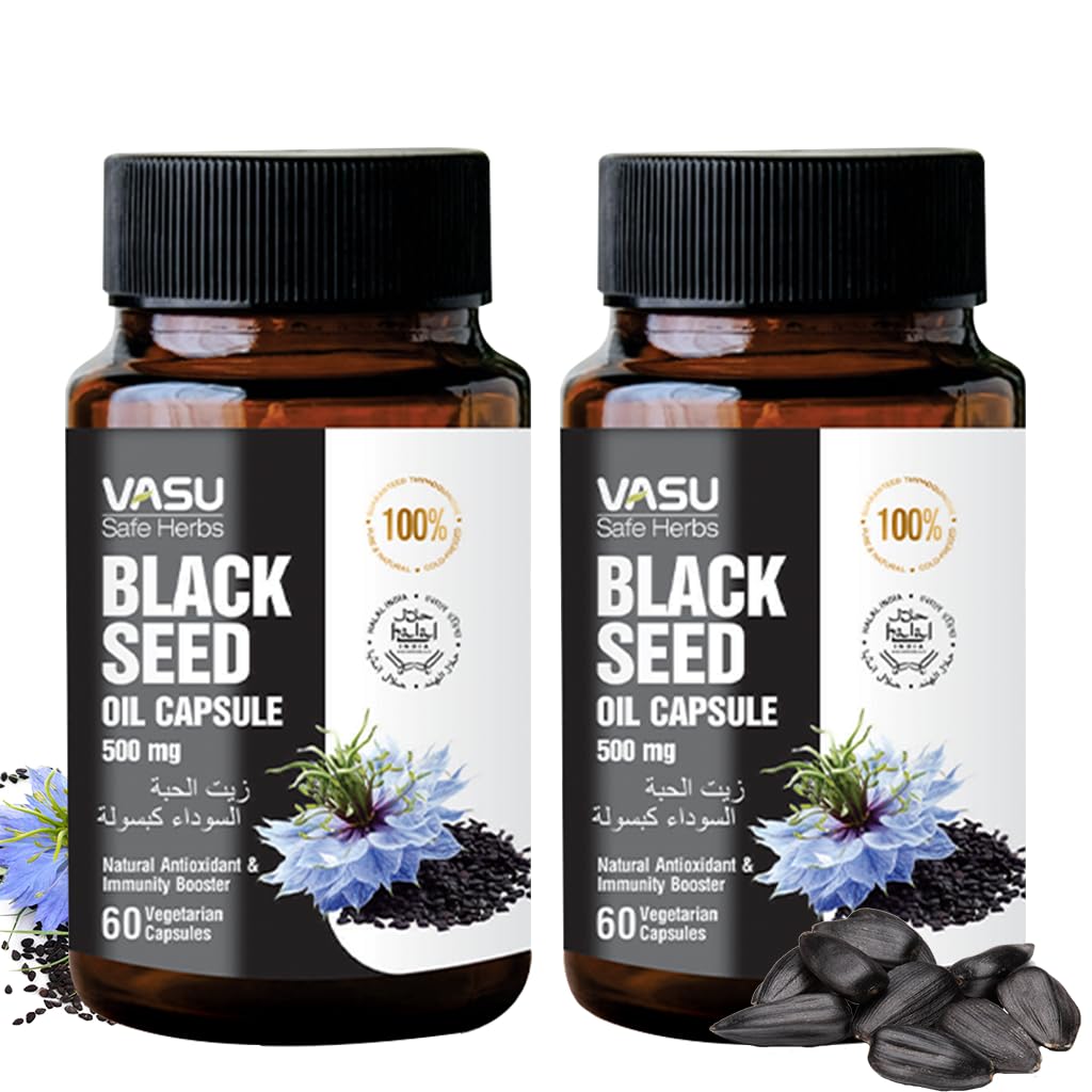 Experience the natural benefits of Vasu Safe Herbs Black Seed Oil Capsules, crafted from cold-pressed Nigella Sativa (Kalonji) oil for everyday wellness support. Known for centuries as the "Seed of Blessing," black seed oil has been valued in traditional wellness practices for promoting vitality and balance. Each vegetarian capsule delivers 500 mg of pure black seed oil, extracted using gentle cold-press technology to help preserve its full nutritional profile. Rich in Thymoquinone and naturally occurring Omega 3, 6, and 9 fatty acids, this herbal supplement helps support immune health, provides antioxidant benefits, and promotes overall well-being. Why Choose Vasu Safe Herbs? High-Quality Cold-Pressed Extraction – Maintains nutrient integrity and purity. Plant-Based Wellness – Pure vegetarian, vegan-friendly formula. Clean Ingredients—Non-GMO, gluten-free, with no artificial additives. Daily Convenience—60easy-to-swallow capsules for one month of use. Whether you're looking to support immune function, maintain healthy skin and joints, or add a plant-based omega source to your nutrition, Vasu Black Seed Oil Capsules offer a trusted, clean, and effective choice. Incorporate it into your daily self-care routine and enjoy the simplicity of a herbal supplement that blends the wisdom of tradition with the assurance of modern manufacturing.Convenient Daily Supplement: Each bottle contains 120 easy-to-swallow vegetarian capsules, crafted for purity and bioavailability. Simple to incorporate into your daily routine to help maintain energy, resilience, and overall well-being. Clean Conscious Formula: Made with non-GMO, gluten-free, and 100 vegetarian ingredients. Free from preservatives, artificial colors, and flavors, making it a safe choice for those who prefer a natural, plant-based wellness option. Plant-Based Omega Fatty Acids: A natural source of Omega 3, 6, and 9 essential fatty acids to help support heart, skin, joint, and brain health. Suitable for men and women seeking a clean, plant-based supplement to complement healthy nutrition. Supports Immune Antioxidant Health: Naturally containing Thymoquinone, black seed oil helps support immune function and provides antioxidant benefits, assisting in the protection of cells from everyday oxidative stress. Ideal for daily wellness routines. Premium Cold-Pressed Black Seed Oil: Each vegetarian capsule contains 500mg pure Nigella Sativa (Kalonji) oil, cold-pressed to help retain natural nutrients. Traditionally valued for supporting overall wellness and vitality as part of a balanced lifestyle.