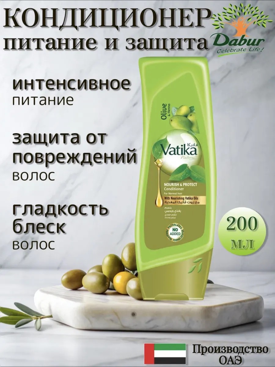 Nourish & Protect Conditioner OLIVE AND HENNA by Dabur Vatika is designed for normal or combination hair. It protects hair from the negative effects of the environment and maintains its elasticity and volume. Natural extracts of aloe vera, henna, olive, and almond support the hair and scalp. Aloe vera extract wonderfully moisturizes and tones the skin, enhances regeneration and healing, and softens the hair. Henna extract nourishes the skin and hair with vitamins, tannins, organic acids, and polysaccharides, creating a protective layer around each hair. Sweet almond extract nourishes and moisturizes the skin, regulates the sebaceous glands, and accelerates hair growth. Vitamin E, found in almonds, slows the aging process. Olive extract deeply nourishes and strengthens the hair, giving it beauty and health.