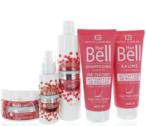 Measurements taken with HairBell in centimeters show an average increase in hair growth rate of 123 over a 28-day treatment period. 95 of participants in the HairBell clinical trial continued using HairBell even after the study. HairBell is completely safe for your health and can be used by everyone (including children and pregnant women) and is suitable for all hair types. HairBell clinical trials prove that hair grows three times faster with HairBell. In just four months, hair can grow faster than it normally grows in a year. Nourished and hydrated, hair is fuller, shinier, and stronger. HairBell shampoo and conditioner are used 1 to 2 times per week. Italicare's LIQUID DIAMONDS Hyaluronic Acid Hair Care Oil is the guardian angel for your hair. With LIQUID DIAMONDS Hyaluronic Acid Hair Oil, suitable for all hair types, your hair will be wonderfully soft and shiny. Thanks to the hyaluronic acid in this non-greasy hair treatment, hair is protected from dryness and combats frizz. The special ultra-nourishing formula of this pomegranate extract hair mask is ideal for detangling and provides intensive care for treated, fine, thin, or damaged hair, giving it a healthier appearance. The hyaluronic acid and pomegranate extract hair mask, with its ultra-nourishing formula, gives your hair softness, shine, and care, making it ideal for fine, thin, and particularly damaged hair. Italicare Hyaluron Power Shampoo with pomegranate extract pampers your hair with its sweet, fresh fragrance and the regenerating power of pomegranate, leaving hair full of volume and shine. The precious pomegranate extract in combination with hyaluronic acid is the guardian angel for colored, brittle, damaged, dry and normal hair.Shampoing hyaluron masque pour cheveux huile capillaire grenade (2 x 300 ml 100 ml) shampoing et après-shampoing HairBell (2 x 200 ml) - Favorise la croissance des cheveux fins, fins et particulièrement abîmés.Les mesures en centimètres réalisées avec HairBell montrent une augmentation moyenne de la vitesse de croissance des cheveux, qui s'élève à 123 pour une période de traitement de 28 jours. 95 des testeurs du test clinique Hairbell ont continué à utiliser Hairbell même après l'étude. HairBell est absolument sans danger pour votre santé et peut toujours être utilisé par tout le monde (y compris les enfants ou les femmes enceintes) et convient également à tous les types de cheveux. Les tests cliniques HairBell prouvent que les cheveux poussent trois fois plus vite avec Hairbell. En seulement quatre mois, les cheveux peuvent pousser plus vite qu'ils ne poussent normalement en un an. Nourris et hydratés, les cheveux sont plus volumineux, plus brillants et plus forts. Le shampooing et l'après-shampoing HairBell s'utilisent 1 à 2 fois par semaine. L'huile de soin capillaire à l'acide hyaluronique LIQUID DIAMONDS d'Italicare est l'ange gardien pour vos cheveux. Avec l'huile capillaire à l'acide hyaluronique LIQUID DIAMONDS, pour tous les types de cheveux, vos cheveux seront merveilleusement souples et brillants. Grâce à l'acide hyaluronique contenu dans ce soin capillaire non gras, les cheveux peuvent être protégés du dessèchement. Agit contre les frisottis. La formule ultra-nourrissante spéciale de ce masque capillaire à l'extrait de grenade est idéale pour démêler les cheveux et un soin intensif pour les cheveux traités, fins, fins ou abîmés pour donner aux cheveux un aspect plus sain. Le masque capillaire à l'acide hyaluronique et à l'extrait de grenade avec sa formule ultra-nourrissante donne à vos cheveux souplesse, brillance et soin pour les cheveux fins, fins et particulièrement abîmés. Le shampooing Italicare Hyaluron Power à l'extrait de grenade dorlote vos cheveux avec son parfum doux et frais et le pouvoir régénérant de la grenade pour des cheveux pleins de volume et de brillance. L'extrait précieux de grenade en combinaison avec l'acide hyaluronique est l'ange gardien pour les cheveux colorés, cassants, abîmés, secs et normaux.