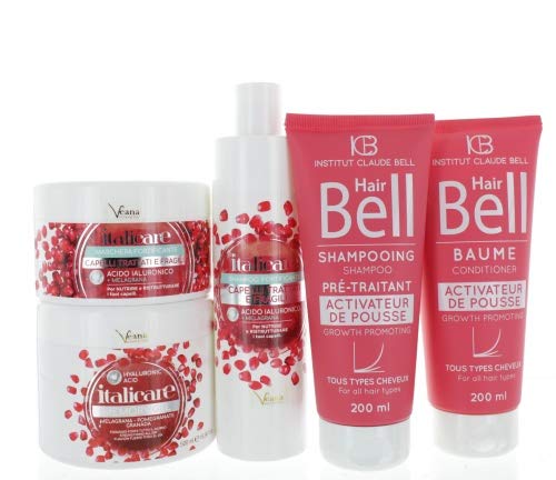 The ultra-nourishing formula of this pomegranate hair mask is ideal for detangling and intensive care for treated, fine, or damaged hair, leaving it looking healthier. The hyaluronic acid and pomegranate hair mask, with its ultra-nourishing formula, provides softness, shine, and care for fine, thin, and particularly damaged hair. Italicare Shape Memory Gel with pomegranate extract and hyaluronic acid – the perfect styling gel for strength, hold, and care. Thanks to this highly effective combination of hyaluronic acid and pomegranate extract, you no longer need to style or condition your hair. You can have both in one step: flexible styling with a strong hold without weighing it down. Italicare Hyaluron Power Shampoo with pomegranate extract pampers your hair with its soft, fresh fragrance and the regenerative power of pomegranate, leaving hair full of volume and shine. Precious pomegranate extract, combined with hyaluronic acid, is a guardian angel for colored, brittle, damaged, dry, and normal hair. For your other hair care needs, we've combined HairBell shampoo and conditioner with Italicare's Premium hair care for in-between treatments. For all hair types, we offer the optimal combination of HairBell and Italicare products. Clinical tests on HairBell prove that hair grows three times faster. In just four months, hair grows faster than its usual annual growth rate. Nourishes and hydrates, leaving hair richer, shinier, and stronger. HairBell shampoo and conditioner are used 1 to 2 times per week.Shampoing hyaluron masque pour cheveux et gel hyaluronique pour cheveux - Grenade (2 x 300 ml 1 x 500 ml) shampoing HairBell après-shampoing (2 x 200 ml) - Pour pousser jusqu'à 3 fois plus rapidementLa formule spéciale ultra-nourrissante de ce masque capillaire à l'extrait de grenade est idéale pour démêler les cheveux et un soin intensif pour les cheveux traités, fins, ou abîmés afin de donner aux cheveux une apparence plus saine. Le masque capillaire à l'acide hyaluronique et à l'extrait de grenade avec sa formule ultra-nourrissante apporte douceur, brillance et soin à vos cheveux pour les cheveux fins, fins et particulièrement abîmés. Gel à mémoire de forme Italicare avec extrait de grenade et acide hyaluronique - Le gel coiffant parfait pour la force, la tenue et le soin. Grâce à cette combinaison très efficace d'acide hyaluronique et d'extrait de grenade, vous n'avez plus besoin de vous coiffer ou de prendre soin. Vous pouvez avoir les deux en une seule étape : coiffage flexible avec une forte tenue sans alourdir les cheveux. Le shampooing Italicare Hyaluron Power à l'extrait de grenade dorlote vos cheveux avec son parfum doux et frais et le pouvoir régénérant de la grenade pour des cheveux pleins de volume et de brillance. L'extrait précieux de grenade en combinaison avec l'acide hyaluronique est l'ange gardien pour les cheveux colorés, cassants, abîmés, secs et normaux. Pour vos autres soins capillaires, nous avons combiné le shampoing et l'après-shampoing HairBell avec le soin parfait de vos cheveux Premium de Italicare pour les soins intermédiaires. Pour tous les types de cheveux, nous vous proposons la combinaison optimale de produits entre HairBell et Italicare. Les tests cliniques sur HairBell prouvent que les cheveux poussent trois fois plus vite. En seulement quatre mois, les cheveux poussent plus rapidement que leur croissance habituelle en un an. Nourrit et hydrate, les cheveux sont plus riches, plus brillants et plus forts. Le shampoing et l'après-shampoing HairBell sont utilisés 1 à 2 fois par semaine.
