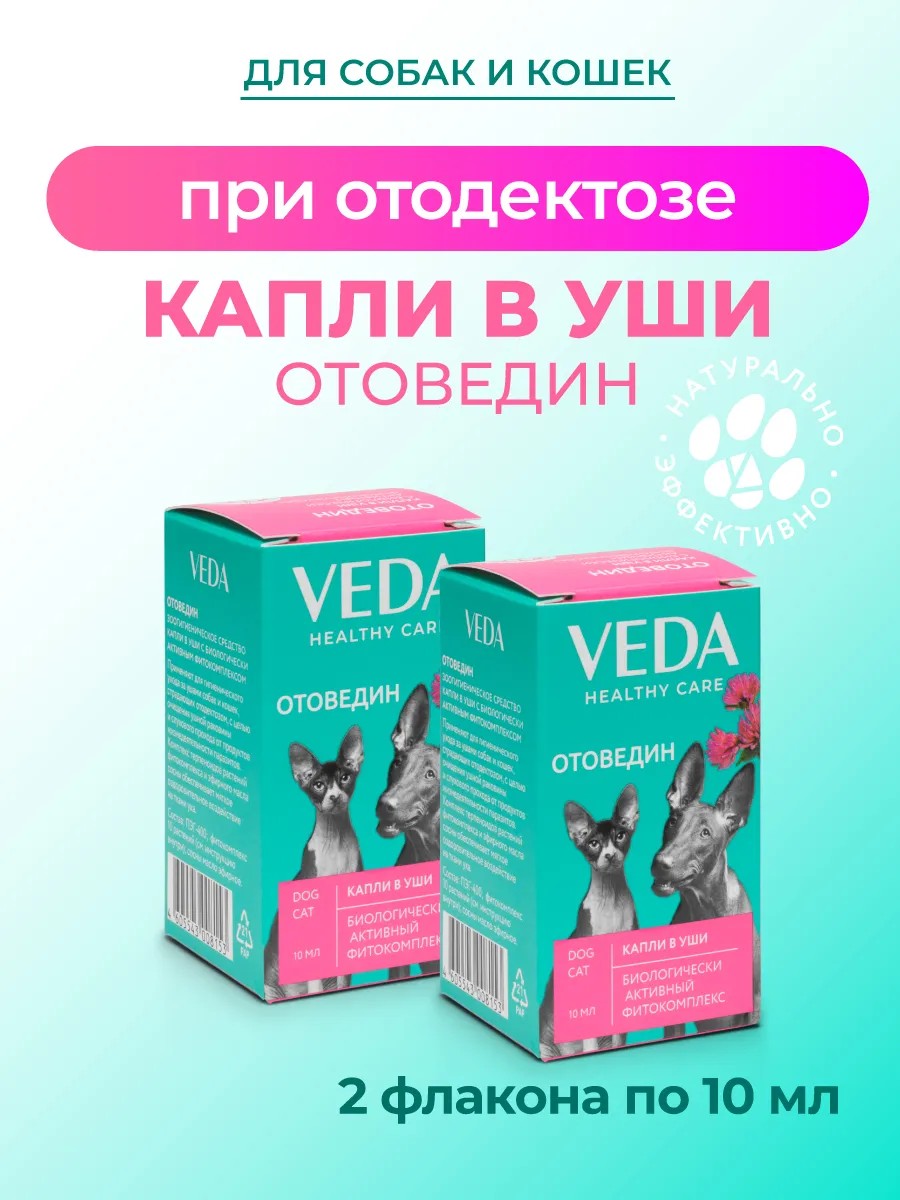 Капли в уши для собак и кошек ОТОВЕДИН с биологически активным фитокомплексом применяются для гигиенического ухода за ушами собак и кошек при отодектозе.
