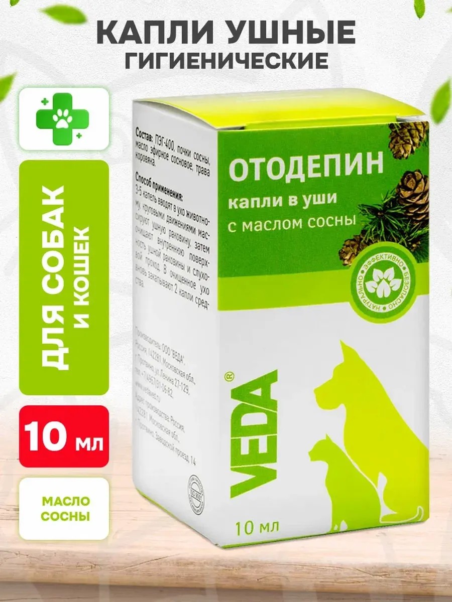 | Комплектация | Отодепин капли для очищения и обработки ушей для собак кошек всех пород с маслом сосны - 10 мл |