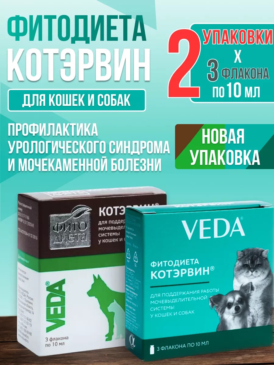 KotErvin is an aqueous extract of medicinal plants. The preparation is a yellow-brown liquid with a slight herbal odor. A sediment may form during storage. It is packaged in 10 ml glass vials, which are packed in cardboard boxes with 3 vials together with a dropper cap. PHARMACOLOGICAL PROPERTIES: the preparation has a saluretic (salt-removing and stone-dissolving), diuretic and anti-inflammatory effect. The feed supplement PHYTODIET KOTERVIN is used to maintain the functioning of the urinary system in cats and dogs: improves the functional state of the kidneys and urinary tract; promotes effective urine output and the removal of inorganic sediment (urinary stones) from the urinary system; Prevents the formation of urinary stones. PHYTODIET KOTERVIN is a decoction of herbal raw materials: knotweed herb - 0.5%, horsetail herb - 0.5%, bird's knotweed herb - 0.5%, resthurium roots - 0.5%; as an auxiliary substance - distilled water - up to 100%. The content of the sum of flavonoids in terms of rutin is not less than 0.004%. TAGS: feed additive for the prevention of urolithiasis in cats and dogs, feed additive KOTERVIN, phytodiet, improves the functional state of the kidneys and urinary tract, prevents the formation of urinary stones, kotervin, cat erwin, urological drug for animals, diuretic for animals, furinaid