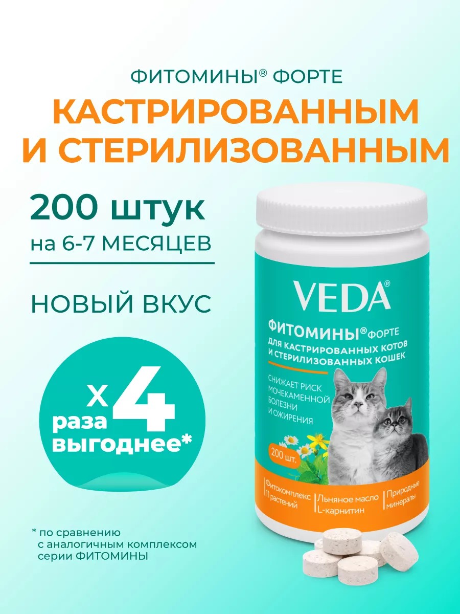 Линейка “Фитомины Форте” от российского производителя ВЕДА для кошек в Вашей ветаптеке — это товары премиум класса для здоровья и красоты домашних питомцев.