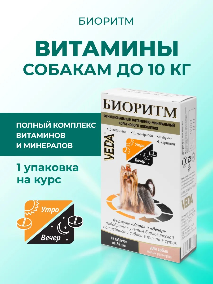 Биоритм для собак малых размеров (до 10 кг) – витаминно-минеральный комплекс из 13 витаминов, 11 минералов, L карнитина и альбумина. мультивитаминный комплекс удовлетворяет суточную потребность собак мелких пород в витаминах и микроэлементах.