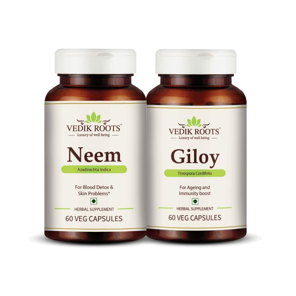 Vedikroots natural neem extracts are added to neem to enhance its beneficial properties and aid in blood purification. Ayurveda Vedikroots neem capsule has detoxifying properties that support maintaining a healthy liver and skin. The 100 organic giloy stem extract powder used to make the Ayurveda Vedikroots brand's Organic Giloy capsule helps fight illnesses while enhancing immunity. Daily use of Vedikroots Neem Giloy capsules promotes liver health, protects against illnesses and infections, and helps to prevent infections, all of which contribute to overall health and wellness.