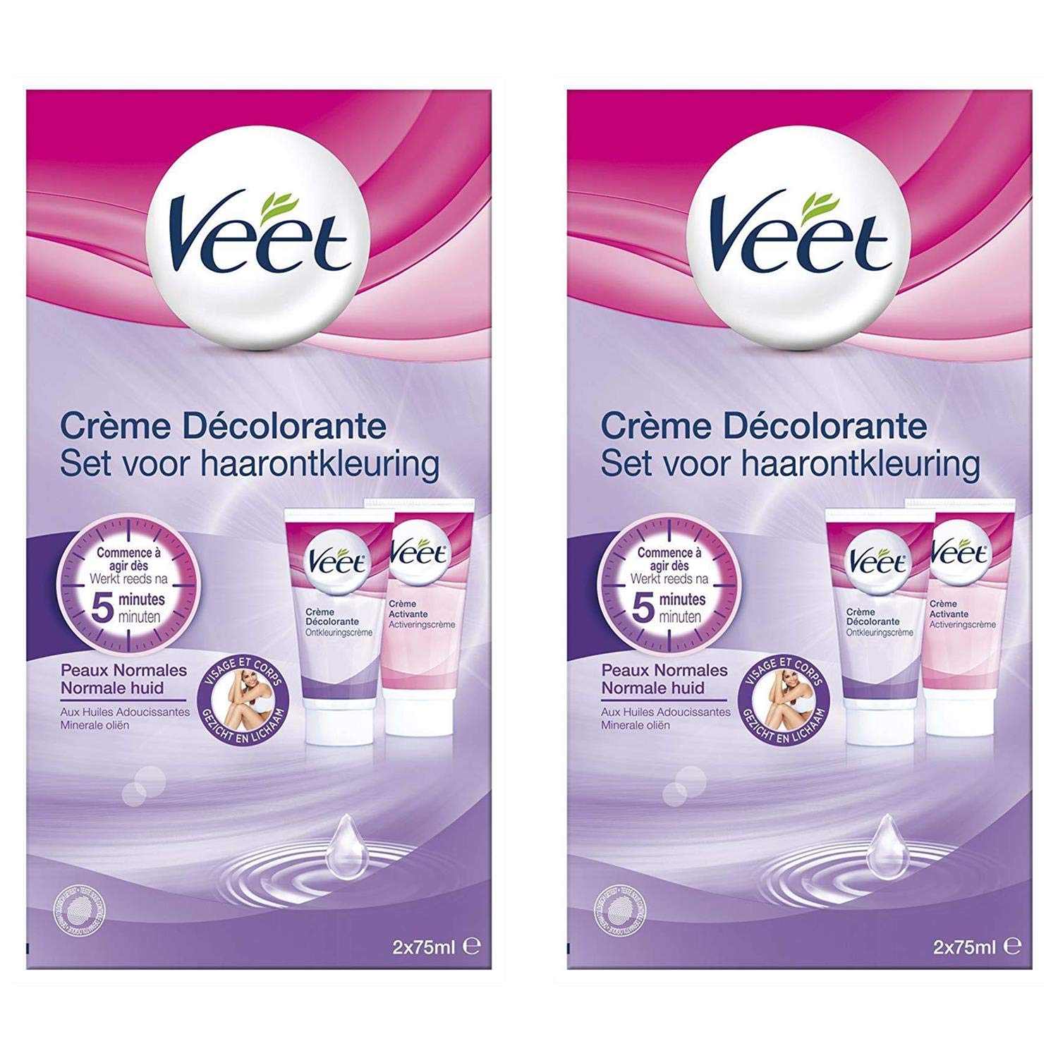 VEET Bleaching Cream - Face and Body 1 case of 2 tubes of 75 ml Veet Bleaching Cream is a method to conceal all hair by bleaching it Suitable for use on upper lip, arms, legs, underarms and bikini line Effective: hairs start to fade after 5 minutes Pleasant: a pleasant scent and texture thanks to softening oils Easy: A spatula and dish for easy mixing, application and removal INGREDIENTS Activating Cream (Pink): Aqua, Cetearyl Alcohol, Ceteareth-20, PPG-15 Stearyl Ether, Ammonium Hydroxide, Sodium Carbonate, BHT, Parfum, Citronellol, Geraniol, Linalool, CI 12490 DIRECTIONS FOR USE 1. First test the bleaching cream on a small area of your skin 24 hours before full use. 2. Apply the white bleaching cream using the spatula provided in the mixing cup. 3. Mix the white cream with the pink activating cream. 4. Apply the mixture to the upper lip, arms, legs, underarms or bikini line. 5. Wait 5 minutes for the hairs to begin to fade. 6. Remove the product using the spatula and rinse the treated area with lukewarm water. EASY - A spatula and a cup for easy mixing, application and removal. PLEASANT - A pleasant scent and texture thanks to softening oils. EFFECTIVE - Hair begins to bleach after 5 minutes. USE - Suitable for use on the upper lip, arms, legs, underarms and bikini line. DERMATOLOGICALLY TESTED - Veet Bleaching Cream is a method to conceal all hair by bleaching it. Its formula is dermatologically tested. VEET Crème Décolorante - Visage et Corps 1 étui de 2 tubes de 75 ml La crème décolorante Veet est une méthode pour dissimuler tous les poils en les décolorant Convient pour une utilisation sur la lèvre supérieure, les bras, les jambes, les aisselles et le maillot Efficace : les poils commencent à se décolorer au bout de 5 minutes Agréable : un parfum et une texture agréables grâce aux huiles adoucissantes Facile : Une spatule et une coupelle pour faciliter le mélange, l'application et le retrait INGRÉDIENTS Crème activante (rose): Aqua, Cetearyl Alcohol, Ceteareth-20, PPG-15 Stearyl Ether, Ammonium Hydroxide, Sodium Carbonate, BHT, Parfum, Citronellol, Geraniol, Linalool, CI 12490 MODE D'EMPLOI 1. Testez d'abord la crème décolorante sur une petite zone de votre peau 24 heures avant utilisation complète. 2. Appliquez la crème décolorante blanche à l'aide de la spatule fournie dans la coupelle de mélange. 3. Mélangez la crème blanche avec la crème rose activante. 4. Appliquez le mélange sur la lèvre supérieure, les bras, les jambes, les aisselles ou le maillot. 5. Attendez 5 minutes pour que les poils commencent à se décolorer. 6. Retirez le produit à l'aide de la spatule et rincez la zone traitée à l'eau tiède. FACILE - Une spatule et une coupelle pour faciliter le mélange, l'application et le retrait. AGREABLE - un parfum et une texture agréables grâce aux huiles adoucissantes. EFFICACE - les poils commencent à se décolorer au bout de 5 minutes. UTLISATION - Convient pour une utilisation sur la lèvre supérieure, les bras, les jambes, les aisselles et le maillot. TESTE DERMATOLOGIQUEMENT - La crème décolorante Veet est une méthode pour dissimuler tous les poils en les décolorant. Sa formule est testé dermatologiquement.