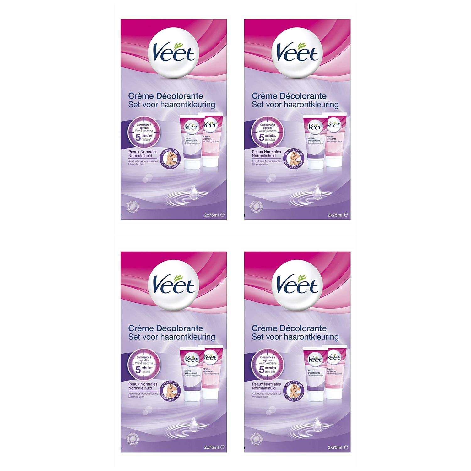 VEET Bleaching Cream - Face and Body 1 pack of 2 x 75ml tubes Veet Bleaching Cream is a method for concealing all unwanted hair by bleaching it. Suitable for use on the upper lip, arms, legs, underarms, and bikini line. Effective: Hair begins to bleach after 5 minutes. Pleasant: A pleasant fragrance and texture thanks to softening oils. Easy: A spatula and mixing bowl for easy mixing, application, and removal. Instructions for use: 1. Apply the product with the spatula provided to the desired area. 2. Wait 5 minutes. 3. Remove the product with the spatula. 4. Rinse off any remaining product.Pleasant: A pleasant fragrance and texture thanks to softening oils. Easy: A spatula and mixing bowl make mixing, application, and removal easy. Effective: Hair begins to lighten after 5 minutes. Suitable for use on the upper lip, arms, legs, underarms, and bikini line. Veet Bleaching Cream is a method for concealing all unwanted hair by bleaching it. VEET Bleaching Cream - Face and Body 1 pack of 2 x 75ml tubes.Description du produit VEET Crème Décolorante - Visage et Corps 1 étui de 2 tubes de 75 ml La crème décolorante Veet est une méthode pour dissimuler tous les poils en les décolorant Convient pour une utilisation sur la lèvre supérieure, les bras, les jambes, les aisselles et le maillot Efficace : les poils commencent à se décolorer au bout de 5 minutes Agréable : un parfum et une texture agréables grâce aux huiles adoucissantes Facile : Une spatule et une coupelle pour faciliter le mélange, l'application et le retrait Mode d'emploi 1. Appliquez le produit avec la spatule fournie sur la zone désirée. 2. Attendez 5 minutes. 3. Retirez le produit avec la spatule. 4. Rincez toute trace de produit restant.Agréable : un parfum et une texture agréables grâce aux huiles adoucissantes Facile : Une spatule et une coupelle pour faciliter le mélange, l'application et le retrait. Efficace : les poils commencent à se décolorer au bout de 5 minutes. Convient pour une utilisation sur la lèvre supérieure, les bras, les jambes, les aisselles et le maillot. La crème décolorante Veet est une méthode pour dissimuler tous les poils en les décolorant. VEET Crème Décolorante - Visage et Corps 1 étui de 2 tubes de 75 ml.VEET Crème Décolorante Visage et Corps - 2 flacons de 75 ml - Lot de 4