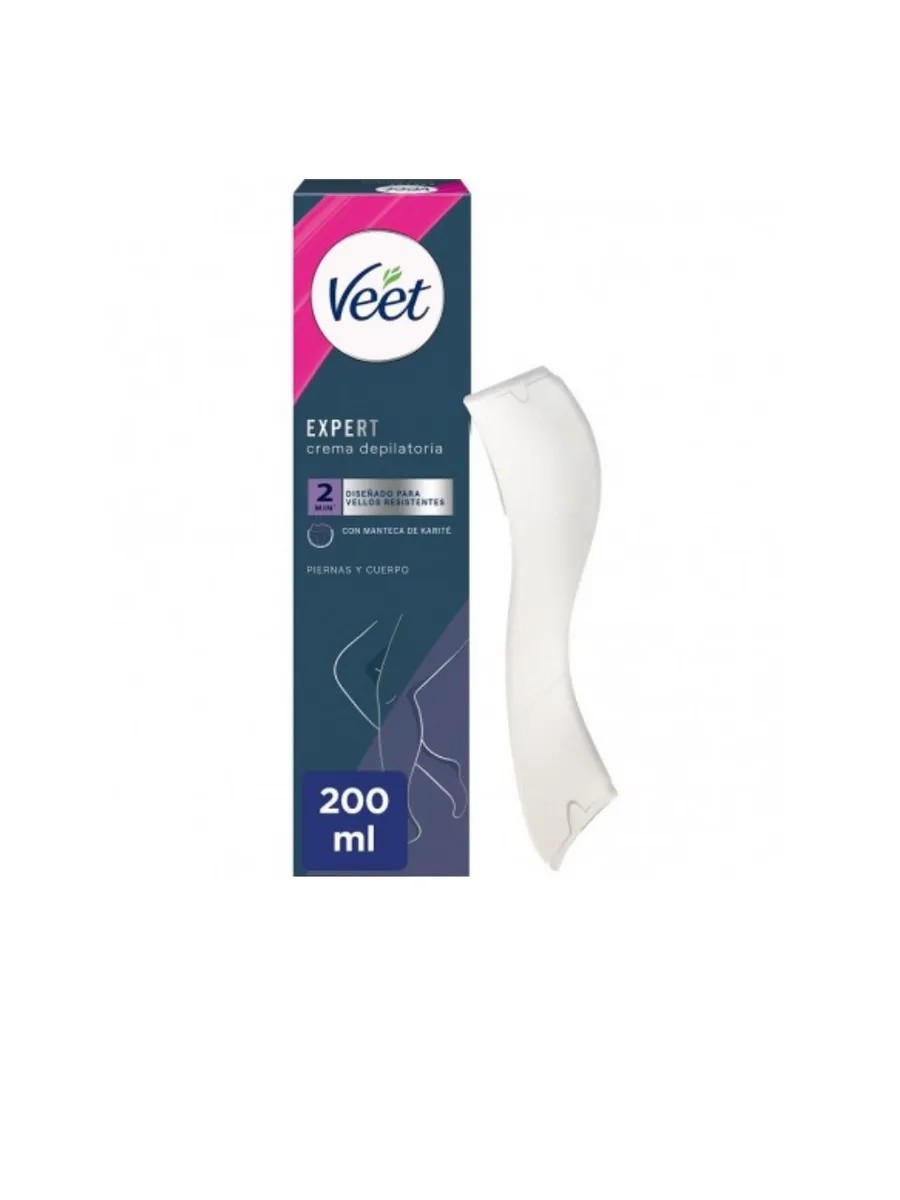 Veet Expert Hair Removal Cream for All Skin Types 200 ml contains shea butter and is enriched with the moisturizing ingredient urea, which is found naturally in human skin. This cream for legs and hands is specially designed to remove coarser hair and provides effective results in just 2 minutes that last up to 48 hours thanks to the product's moisturizing properties. This depilatory body cream is dermatologically tested and suitable for all skin types, including sensitive skin. The hair removal cream begins working within 2 minutes of application. BEFORE USING THIS PRODUCT, READ THE PRECAUTIONS FOR USE CAREFULLY. Directions for use: Using the included spatula, apply the cream to clean, dry skin without rubbing, covering the hair well. Leave on for 2-4 minutes. Use the spatula to apply the cream. Test hair removal on a small area using the spatula. If hair does not come off easily, leave it on for another 1-2 minutes. Rinse thoroughly with cold water without soap. DO NOT EXCEED A TOTAL CONTACT TIME OF 8 MINUTES. Do not use on wounds, moles, chapped, irritated, or burned skin, or on skin that is intolerant to hair removal creams. Before using the product, conduct a small test on the area to be depilated. If no adverse reactions occur after 24 hours, you can proceed with epilation. If tingling or burning occurs during epilation, remove the product immediately and rinse thoroughly with cold water. If symptoms persist, consult a doctor. Always wait 72 hours between uses. For 24 hours before and after epilation, avoid sun exposure, bathing, or using deodorants or other products containing alcohol or perfume. KEEP OUT OF REACH OF CHILDREN. Avoid contact with eyes. In case of contact with eyes, rinse immediately with water. Do not swallow.