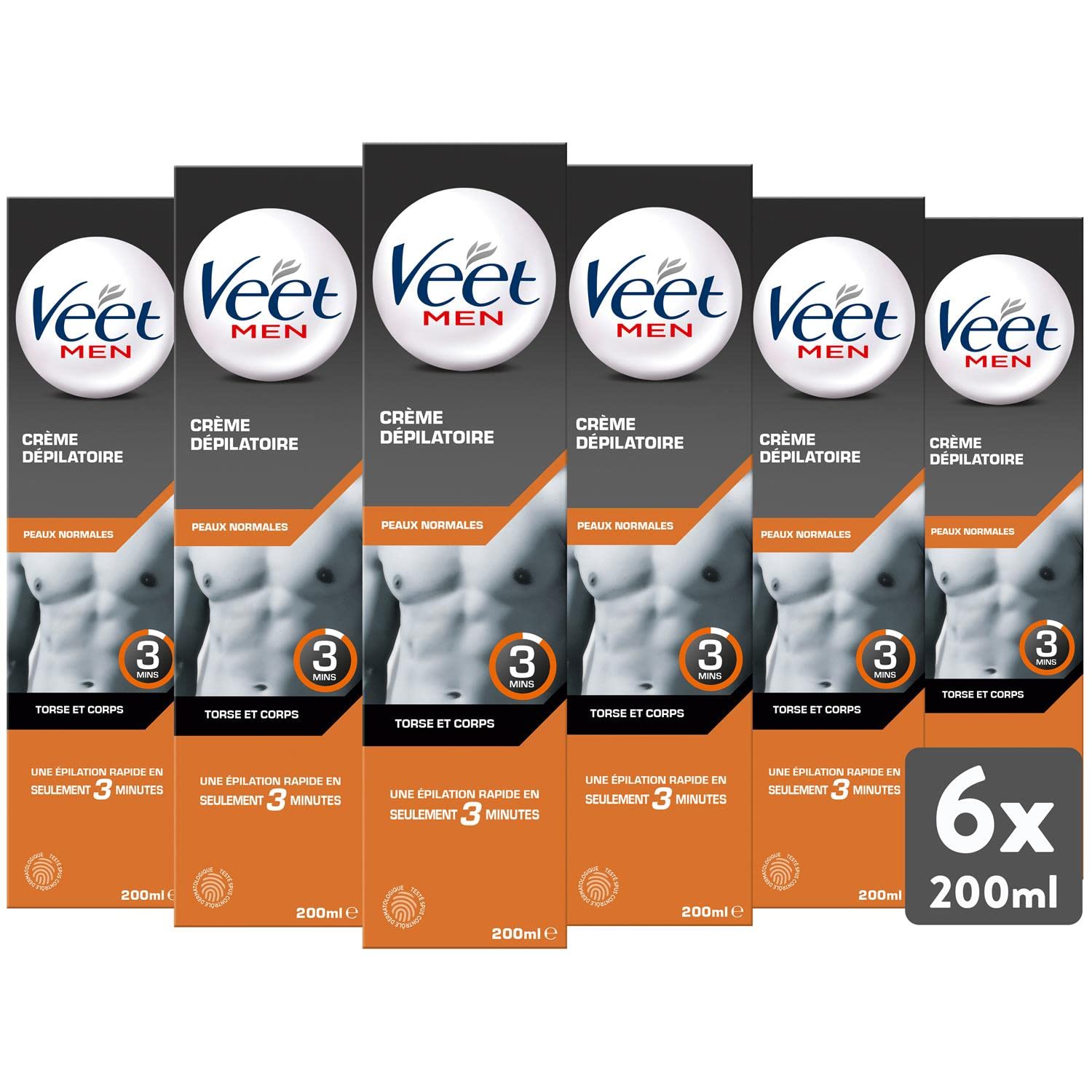 FOR THE BODY - Veet Men Hair Removal Cream can be used on the chest and the entire body Chest, Back, Underarms, Groin, Arms, Legs. EFFECTIVE - Works close to the root to remove even the shortest hairs without the pain of waxing. QUICK EASY: Removes hair in just 3 minutes. THIS PACK CONTAINS - 6 x 200ml Veet Men Hair Removal Creams for Normal Skin.POUR LE CORPS - La Crème Dépilatoire Veet Homme peut être utilisée sur le torse et l'ensemble du corps Torse, Dos, Aisselles, Aine, Bras, Jambes. EFFICACE - Agit proche de la racine pour retirer même les poils les plus courts sans la douleur de l'épilation. RAPIDE SIMPLE : élimine les poils en seulement 3 minutes. CE LOT CONTIENT - 6 Crèmes Dépilatoires Veet Men de 200ml pour Peaux Normales.VEET - Lot de 6 Crèmes Dépilatoires Homme 200ml Peaux Normales