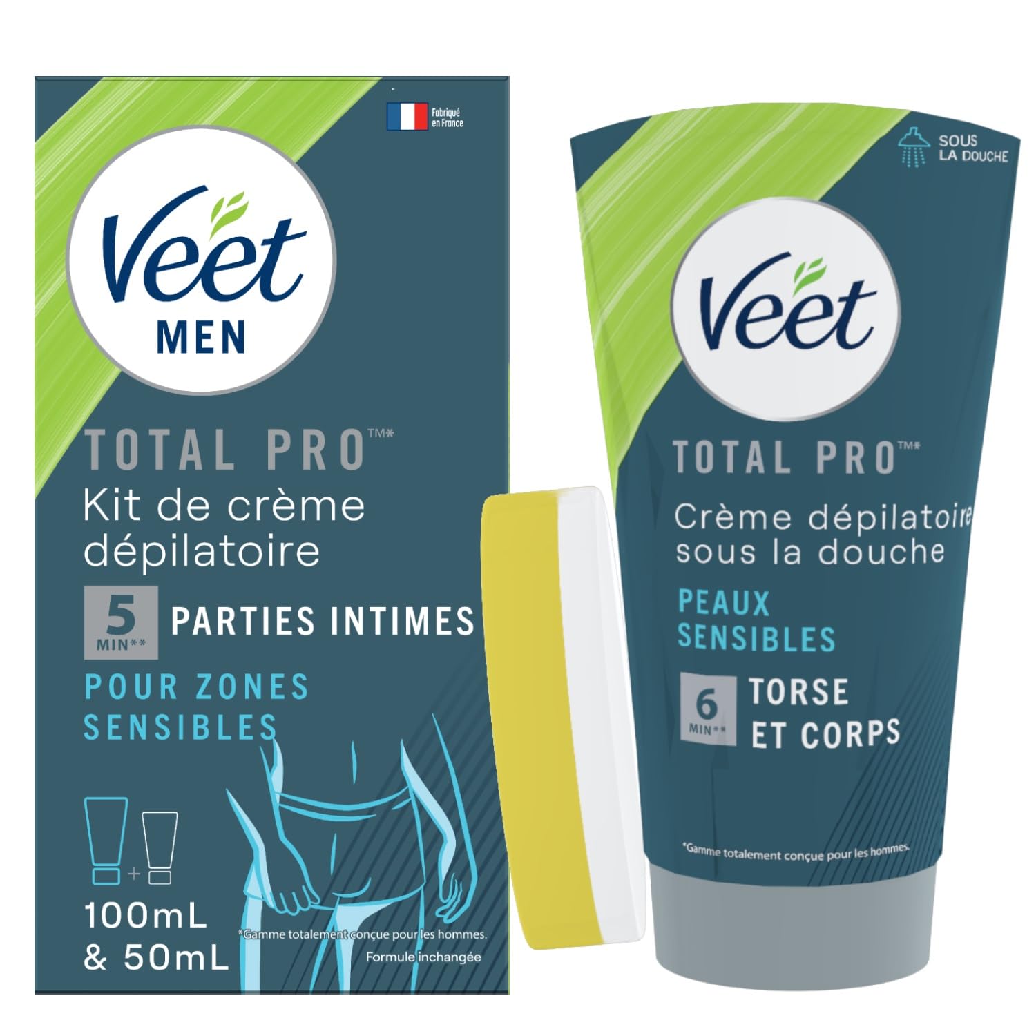 VEET MEN - Lot de 2 Cr mes D pilatoires Homme Peaux Sensibles - Corps & Torse Sous la Douche 150ml - Parties Intimes 100ml avec Baume Soin Aloe Vera 50ml