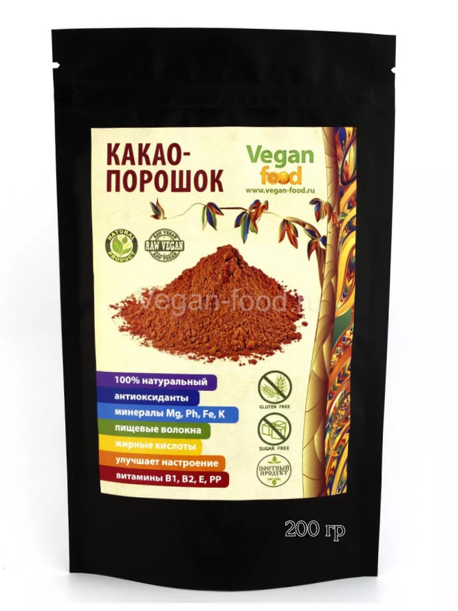 Какао-порошок Vegan Food не проходит химической обработки, он неалкализованный, абсолютно безопасен, без глютена, не содержит усилитель вкуса.