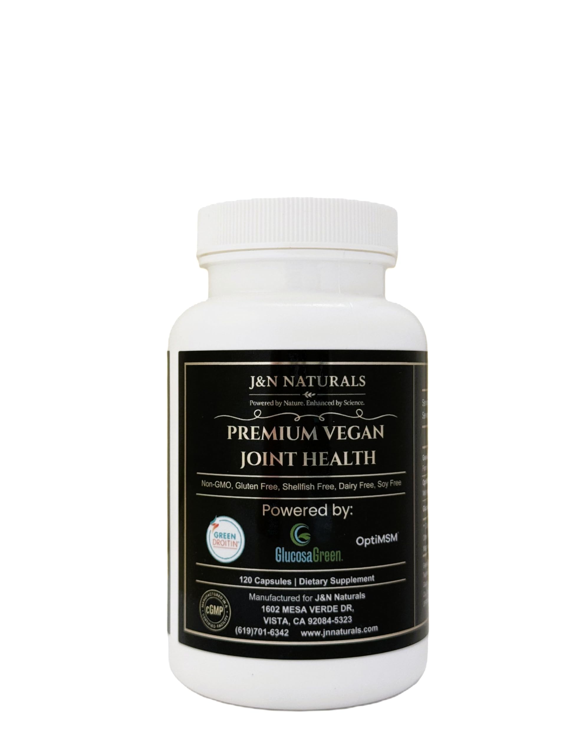 CLINICAL STUDIES: important dietary nutrient to support healthy aging. With its regulation of glutathione and other ways in the body, MSM helps support healthy skin, joint mobility, cartilage, and the antioxidant response. J N Naturals Vegan Joint Support is a next-generation plant-based alternative to traditional glucosamine and chondroitin supplements—crafted for people who demand performance without animal ingredients. SUPPORTS ACTIVE LIFESTYLES HEALTHY AGING Perfect for athletes, fitness enthusiasts, and aging adults seeking daily joint mobility, flexibility, and comfort—so you can stay active without stiffness holding you back. CLEAN LABEL YOU CAN TRUST – NON-GMO, GLUTEN-FREE, SOY-FREE Formulated with no artificial colors, flavors, preservatives. Non-GMO, gluten-free, and soy-free for clean daily supplementation you can feel good about. MADE IN THE USA – THIRD-PARTY TESTED FOR QUALITY Manufactured in the USA in a cGMP-certified facility and tested for purity and potency. Each bottle delivers 120 easy-to-swallow capsules for a full 30-day supply. 100 PLANT-BASED – NO SHELLFISH, NO BOVINE, NO ANIMAL BY-PRODUCTS J N Naturals is completely vegan, making it ideal for plant-based lifestyles and anyone with shellfish allergies or ethical concerns. Encourages Long-Term Comfort — OptiMSM assists connective tissue health and recovery. Promotes Everyday Flexibility — Vegan Glucosamine supports joint lubrication and mobility. Supports Comfortable Joint Movement — GreenDroitin helps cushion joints and supports cartilage integrity. Premium Vegan Formula: Features three branded ingredients - GreenDroitin (plant-derived chondroitin), GlucosaGreen (vegan glucosamine), and OptiMSM (ultra-pure MSM) -designed for daily mobility and long-term joint care without animal ingredients.