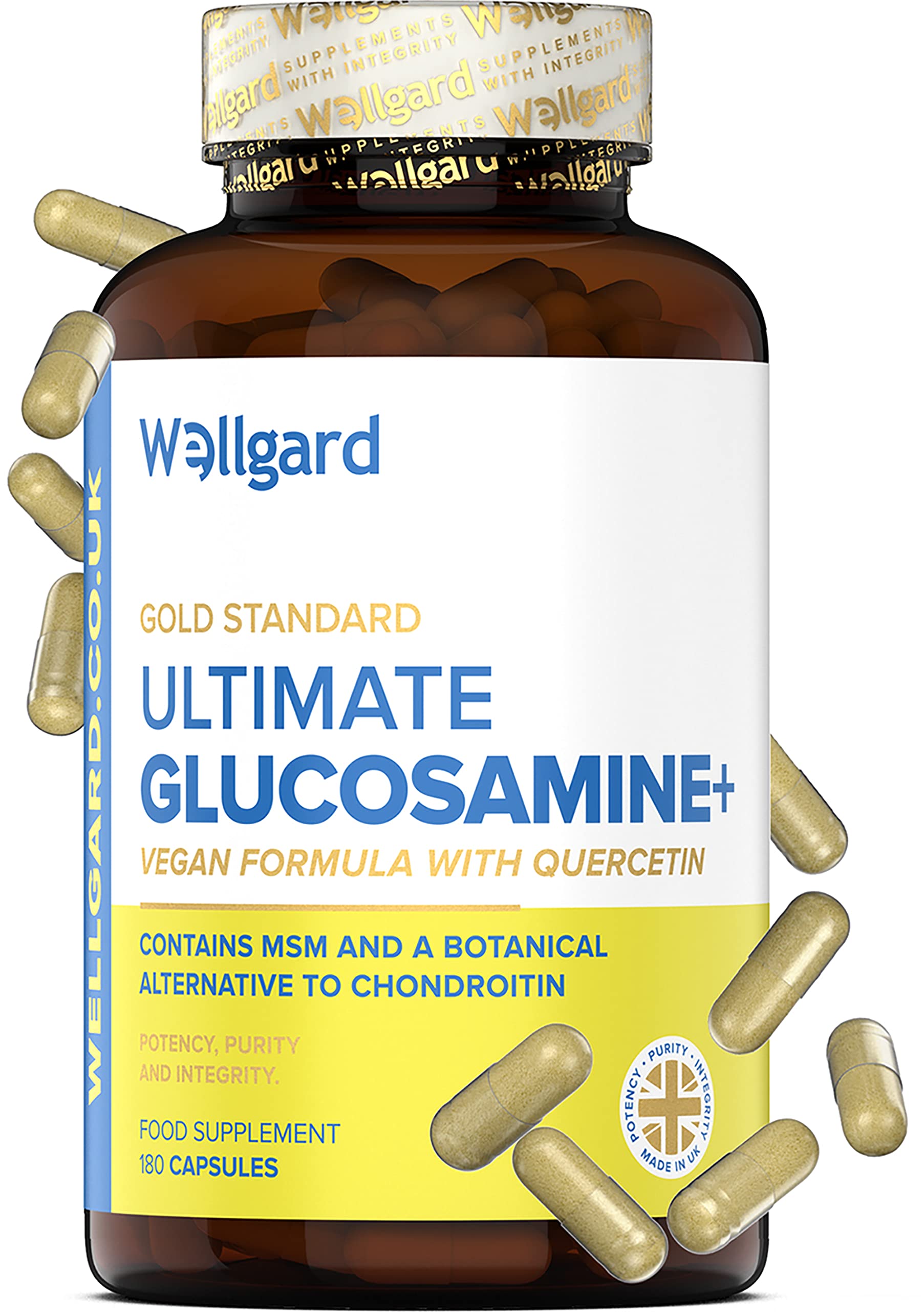 INGREDIENTS Glucosamine Sulphate Dipotassium Chloride (Plant-derived), Hydroxypropylmethyl Cellulose (Capsule Shell), Phydroitin Complex (Ulva Lactuca, Fucus Vesiculosus, Sodium Hyaluronate), Methylsulphonly Methane Preparation (Methylsulphonyl Methane, Silicon Dioxide), Ginger Root Extract, Rosehip Extract, Rice Extract Preparation (Rice Extract, Rice Fibre, Acacia Gum, Sunflower Oil), Quercetin Dihydrate, Rice Fibre. DIRECTIONS 3 CAPSULES, PREFERABLY WITH A MEAL. SAFETY WARNING Do not exceed recommended dose and consult your GP if pregnant, lactating, taking medication or under medical supervision. Food supplements are not a substitute for a varied diet and healthy lifestyle. Not intended for use by persons under the age of 18 years. Store in a cool and dry place. Keep out of the reach of children. MANUFACTURER CONTACT INFORMATION Bayagan Group Ltd, Unit 9 Westergate Business Centre, Brighton BN2 4QN See moreVEGAN-FRIENDLY CLEAN FORMULATION - Vegans can have peace of mind knowing that Wellgard Ultimate Glucosamine capsules are 100 vegan. The formula is free from animal products or derivatives, gluten, wheat, yeast, milk, lactose, soy, artificial flavours, artificial sweeteners, preservatives. SYNERGISTIC COMBINATION OF INGREDIENTS - Wellgard Ultimate Glucosamine is formulated with a synergistic combination of sought-after ingredients such as Ginger Root Extract (25mg), Rosehip Extract (25mg), Quercetin (20mg) and Methyl sulphonyl methane (75mg). MADE WITH A BOTANICAL ALTERNATIVE TO CHONDROITIN – We use a botanical alternative to Chondroitin in our formulation because Chondroitin is usually obtained from animal sources, including shark cartilage. MADE WITH VEGETABLE-DERIVED GLUCOSAMINE – Many supplements use Glucosamine that has been derived from crustacean shells, but our Glucosamine is derived from corn syrup. ULTIMATE VEGAN GLUCOSAMINE - Wellgard Ultimate Glucosamine provides more Glucosamine base per daily dose when compared to many brands. With 1100mg per daily dose, our glucosamine supplement provides the maximum dose permitted in a food supplement.