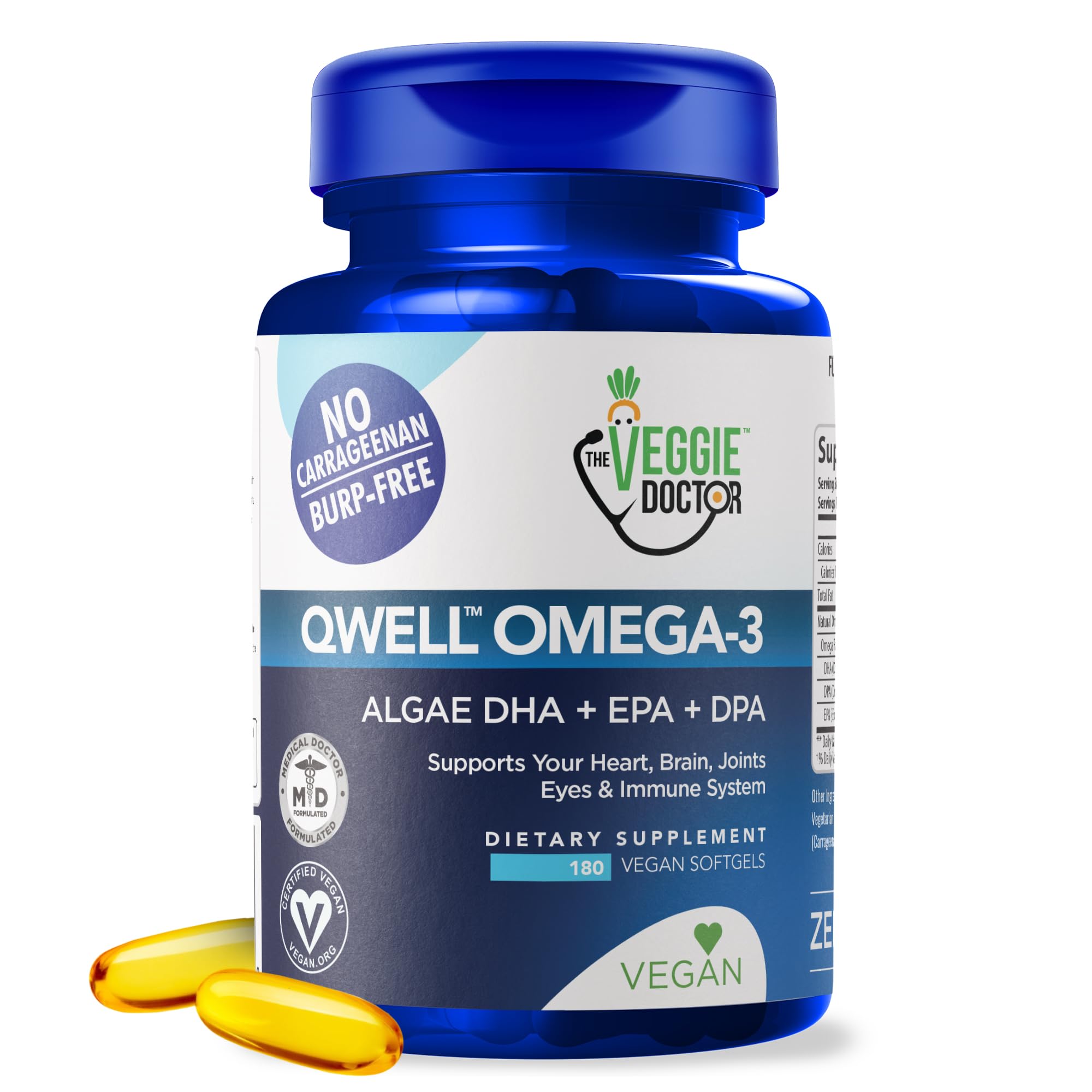 DOCTOR-FORMULATED TRUSTED: Formulated by health professionals, QWELL's vegan omega-3 capsules are designed to support cognitive, joint, eye, immune, and heart health as part of your daily wellness routine. This pure, plant-based formula offers a reliable, fish-free option for those committed to sustainable, high-quality nutrition. CLEAN, SUSTAINABLE VEGAN OMEGA FORMULA: Say goodbye to fishy aftertastes with this algae oil omega-3 supplement. Our vegan DHA and EPA formula is designed to support brain performance, joint comfort, and heart function. It's ideal for those seeking a vegetarian or algae-based omega-3 option, made without fillers or carrageenan for maximum purity and performance. . ALGAL OIL SUPPLEMENT – FISH-FREE: QWELL's algae-based omega-3 oil is farm-raised, non-GMO, carrageenan-free, and burp-free. This vegan supplement offers ocean-safe nutrition without the concerns of marine pollutants. Get your essential fatty acids from the original source—algae. Perfect for anyone looking for clean, plant-powered omega-3s like vegan DHA and EPA. . HIGH-POTENCY DHA, EPA DPA BLEND: Each vegan omega capsule delivers a concentrated dose of DHA, EPA, and DPA derived from algae. DPA works synergistically with EPA to help optimize omega-3 absorption and support your body's natural balance. A powerful daily formula designed for whole-body wellness and plant-based immune system support. . VEGAN OMEGA-3 FROM ALGAE: Our vegan omega-3 supplement is made from pure, sustainably sourced algae oil—no fish, no contaminants. It's packed with DHA, EPA, and DPA to help support brain function, heart health, joint mobility, and eye wellness. A clean, plant-based alternative to fish oil, ideal for those seeking maximum bioavailability from a vegan source.