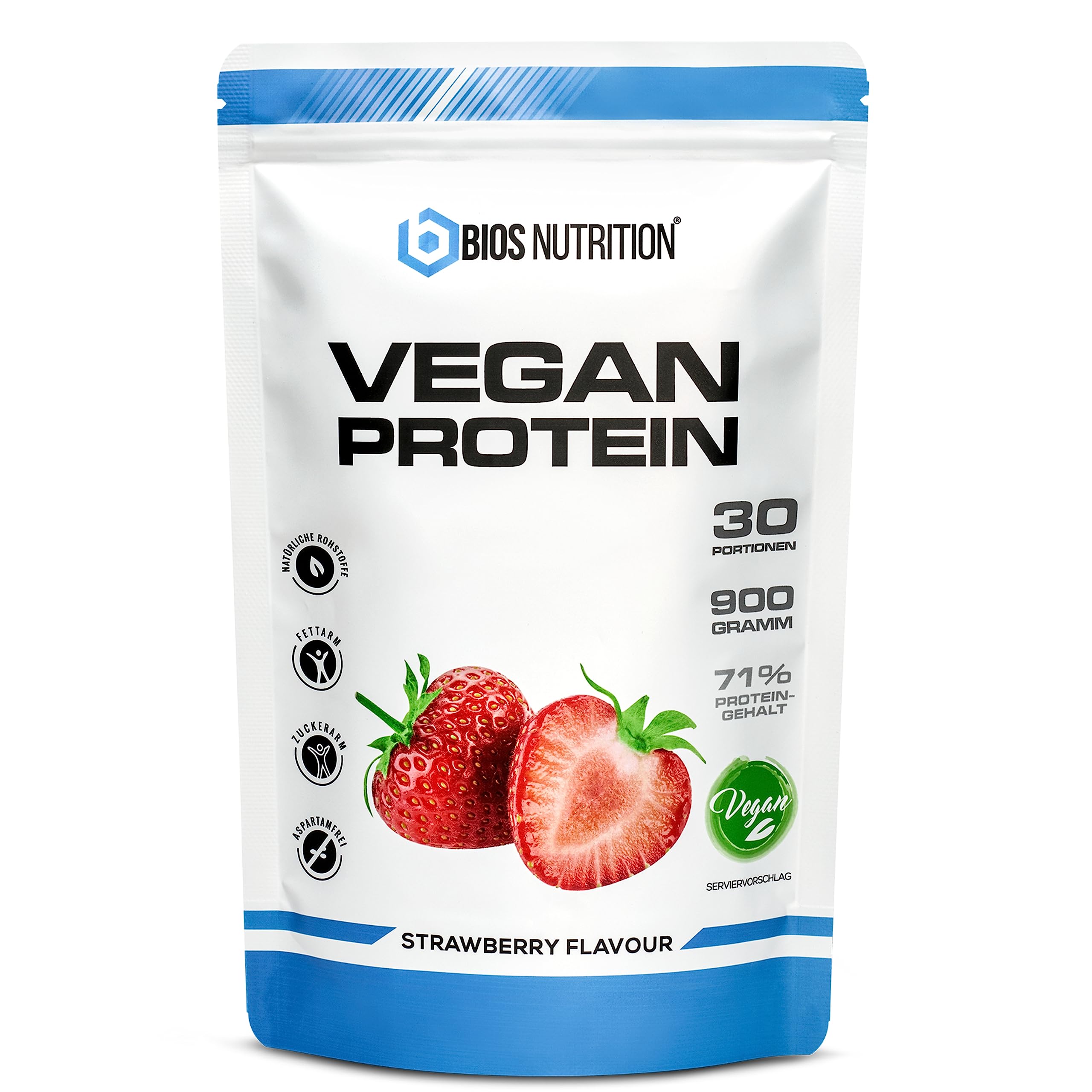 Vegan Protein ERDBEERE 900gr - 4K veganes Proteinpulver - Natürlich lecker im Geschmack - pflanzliches Protein ohne Laktose ohne Soja - BIOS Nutrition (Made in Germany) Erdbeere 900 g (1er Pack)