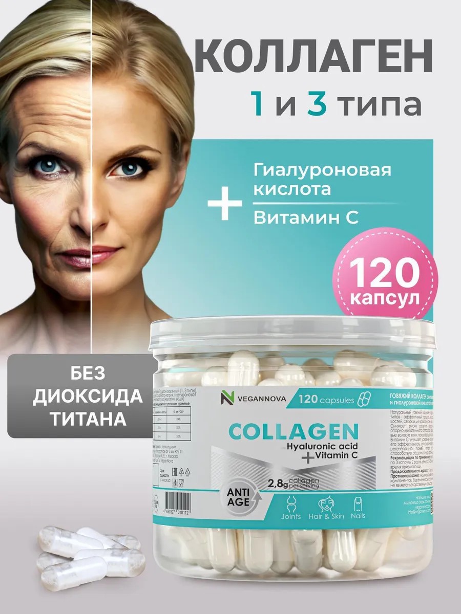 Коллаген говяжий в капсулах с витамином С и гиалуроновой кислотой VeganNova - это смесь коллагенов 1 и 3 типов.