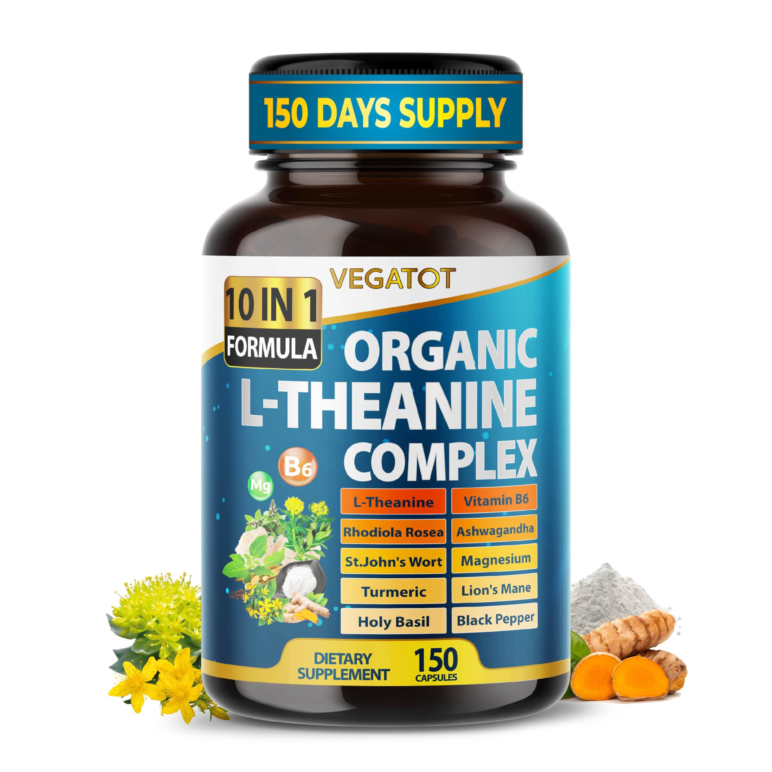 VEGATOT Ultra Organic L-Theanine Complex 10-in-1 Formula with Vitamin B6, Magnesium, Rhodiola, Ashwagandha, Turmeric & Holy Basil Supports Calm Mood, Relaxation & Focus 150 Capsules 150 count (pack of 1)