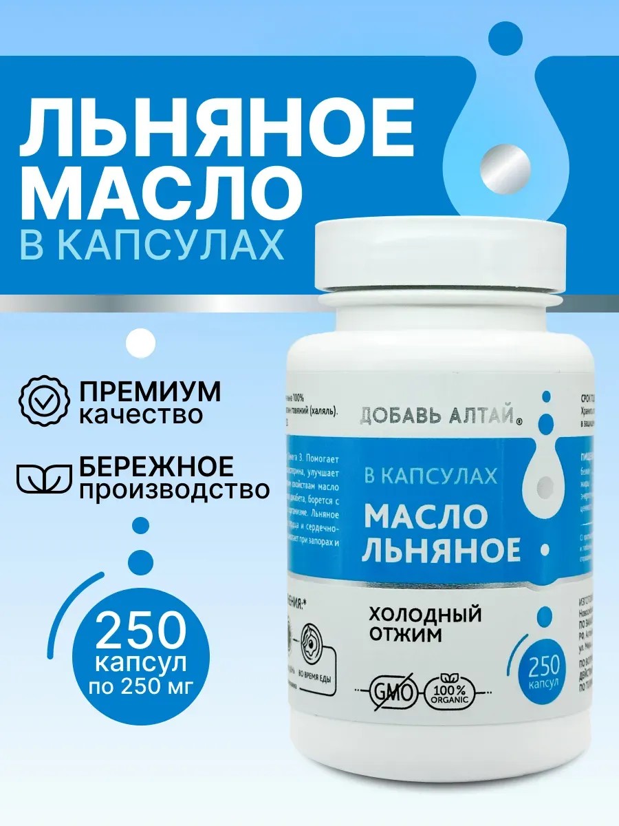 Алтайский лен – природный источник селена, богат витаминами В А Е К. Основная его ценность - наличие в составе большого количества полиненасыщенных жирных кислот. Благодаря бережной технологии производства, льняное растительное масло сохраняет в себе все уникальные ценные свойства. Желатиновая оболочка обеспечивает свежесть и качество продукта в течение длительного времени. Капсула гарантирует точную дозировку, защищает от окисления и исключает горечь. Полученная продукция обладает приятным тонким вкусом. Омега 3 - 6 - 9 необходимы в рационе взрослого человека. Линоленовая - предупреждает болезни сердца, возникновение инсульта и инфаркта. Важна для мозга и нервной системы. Линолевая кислота нужна для роста волос и ногтей, для красоты и молодости кожи. Снижает уровень сахара и холестерина в крови, чистит сосуды и улучшает кровоток. Олеиновая - замедляет процессы старения, повышает иммунитет. Способствует ускорению метаболизма, обмена веществ. Издавна в народной медицине семена льна применялись при проблемах с пищеварением. Это известное слабительное средство для очищения кишечника, устранения запора и похудения. Суперфуд с детокс эффектом поможет в коррекции веса и фигуры. Полезный натуральный суперпродукт поддерживает гормональный баланс в организме женщины. По рекомендации врача можно пить при беременности. Препарат благотворно влияет на правильное функционирование матки и яичников. Регулирует менструальный цикл. Облегчает симптомы климакса, менопаузы. У мужчин служит дополнительным средством усиления потенции, помогает в борьбе с простатитом. Оказывает противовоспалительное, мочегонное и бактерицидное действие. Позволяет справиться со стрессом, устраняет бессонницу и снимает напряжение. Нормализует артериального давления, показано при гипертонии и в составе комплексной терапии сердечных заболеваний. Как антиоксидант проявляет себя в защите клеток от вредного воздействия. Обволакивая, регенерирует и заживляет поврежденные ткани слизистой желудка. Обезвреживает токсины. Принимайте наши пищевые масла для сибирского здоровья! Перед употреблением рекомендуем проконсультироваться с врачом. Не является лекарственным средством.