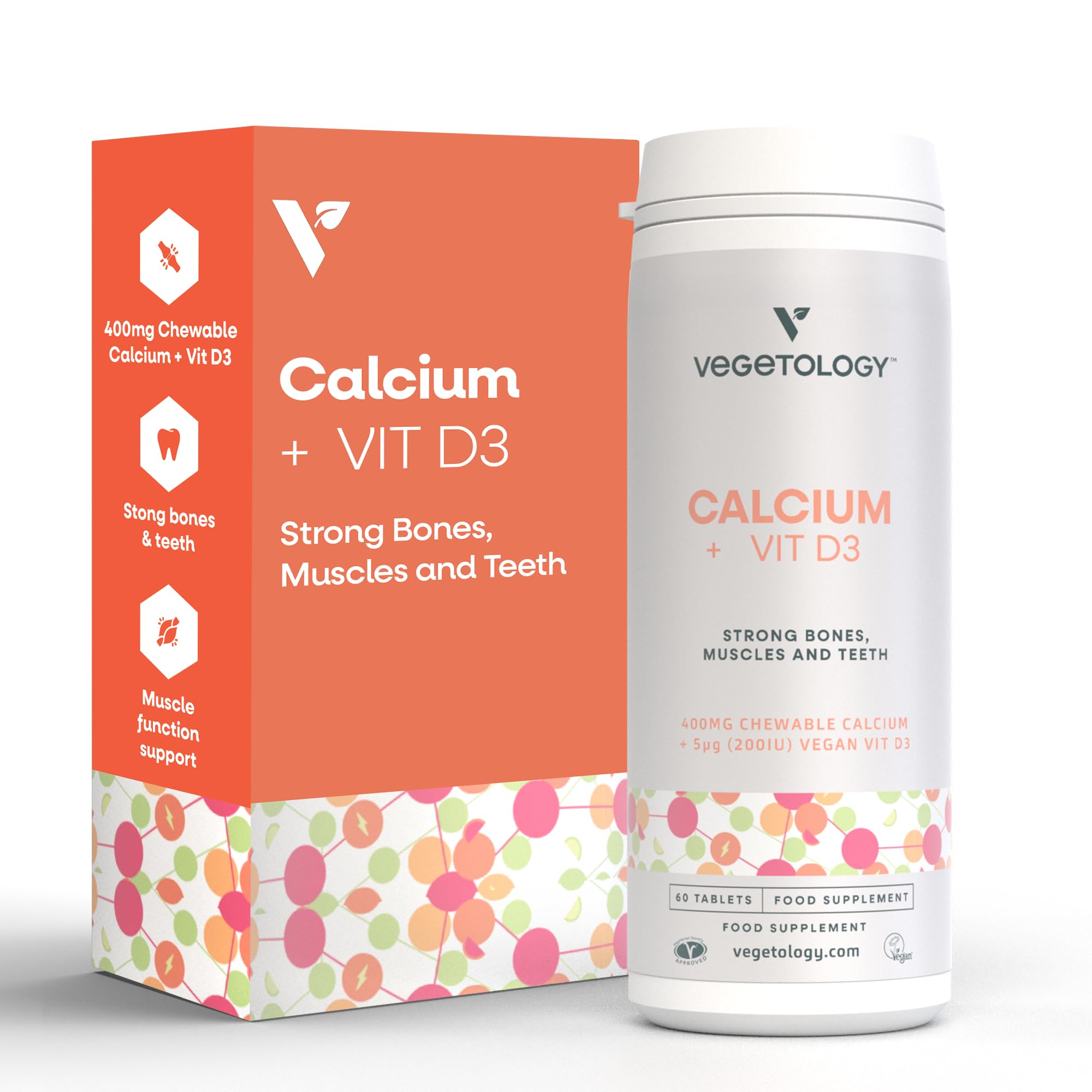 Vegetology Calcium Tablets and Vitamin D3, Chewable Vegan Supplement, Helps Maintain Strong Bones and Support Muscle Function, 60 Count, Age 11+