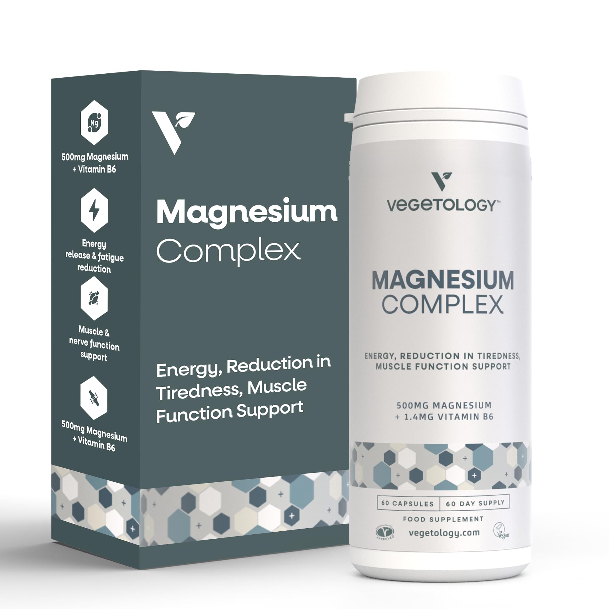 Vegetology Magnesium Supplements with Vitamin B6, 3-in-1 Complex, 60 Vegan Capsules, High Strength, Supports Energy, Muscle Function, and Overall Wellness, Age 11+