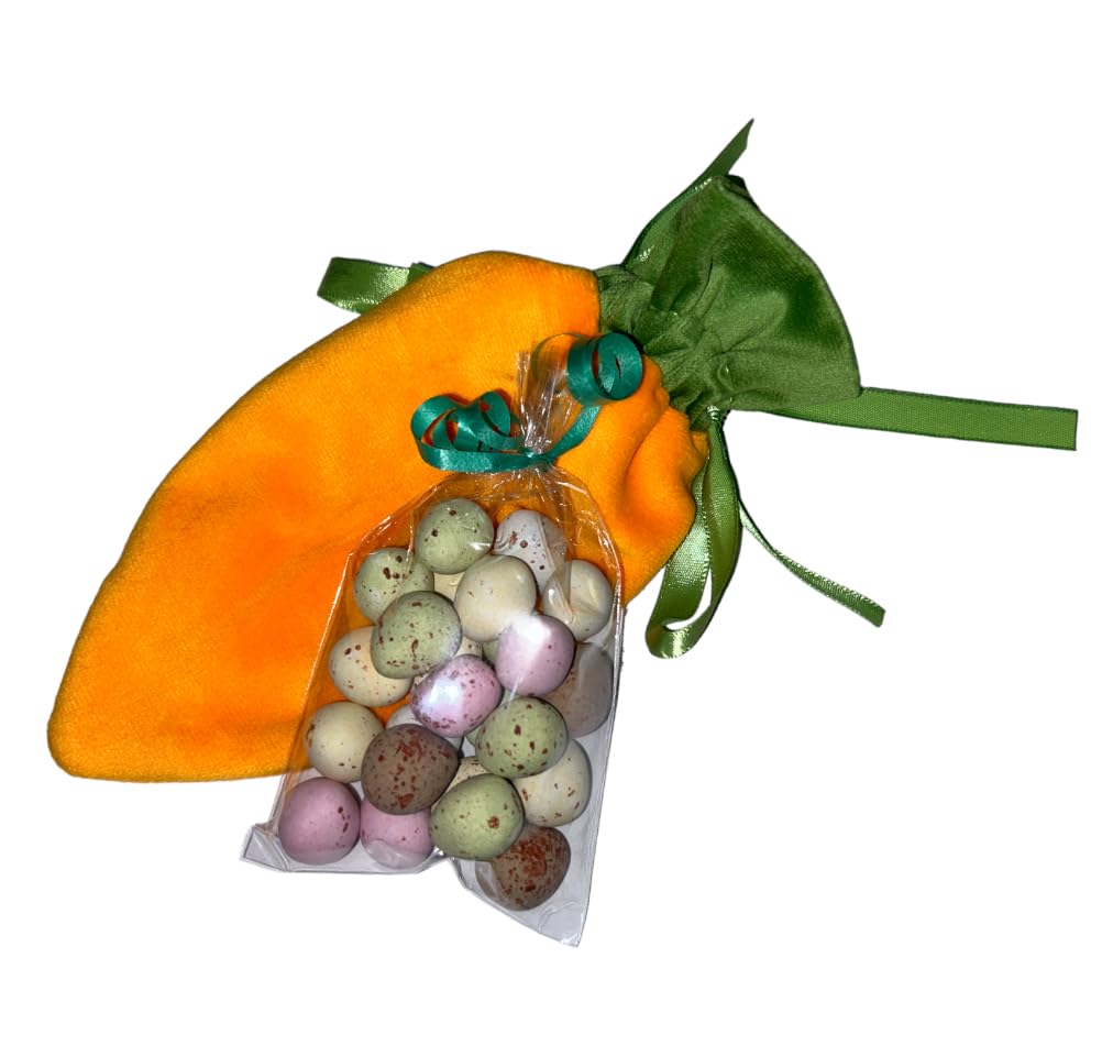 Easter sweets mix bag Chocolate flavoured Mini eggs ingredients:May contain traces of nuts peanuts. Milk Chocolate 70 (Sugar, Cocoa Butter, Skimmed Milk Powder, Cocoa Mass, Whey Powder (Milk), Lactose (Milk), Butter Oil (Milk), Emulsifier (Soya Lecithin), Flavouring), Sugar, Glazing Agent (Gum Arabic), Rice Starch, Malt Barley Extract, Colours (Anthocyanins, Carotenes, Curcumin), Spirulina Concentrate. Milk chocolate contains Cocoa Solids 25 min, Milk Solids 14 min. Choking Warning: Not suitable for children under 36 months Gummy Rabbit Head Sweets Ingredients: Glucose syrup, Sugar, Water, Pork Gelatine, Acids (Lactic, Malic, Citric), Gelling Agent (Pectin), Flavourings, Fruit and Vegetable Concentrates (Black Carrot, Grape), Colour (Curcumin), Vegetable oil (Coconut), Glazing agent (Carnauba wax). Multicoloured Foiled Chocolate Flavoured Eggs Ingredients: Ingredients: Sugar, Vegetable Oil, Whey Powder (from MILK), Reduced Fat Cocoa Powder, Emulsifier (Sorbitan Tristearate, SOYA Lecithin), Natural Bourbon Vanilla Flavouring. Allergy Advice: Contains MILK and SOYA. Gold Milk Chocolate Créme Filled Bunnies Ingredients: May contain traces of Cereals containing gluten 20ppm, Nuts, Milk Chocolate (60 ) Sugar, Whole milk powder, Cocoa mass, Cocoa butter, Whey powder (Milk), Emulsifier (Soya lecithin), flavouring. Milk crème filling (40 ) Sugar, Vegetable Oils (Palm), Skimmed milk powder, Whey powder (Milk), Lactose (Milk), Whole milk powder, Emulsifier (Soya lecithin). Milk chocolate contains cocoa solids 28 minimum, milk solids 16 minimum. INGREDIENTS Chocolate, sweetsNo extra postage fee if purchased more than one carrot. Ingredients and best by date on sweet or chocolate package. Easter sweet treat. Great gift for easter. Filled with Choice of Easter sweets or chocolate from the list. Velvet drawstring Carrot Easter bag.