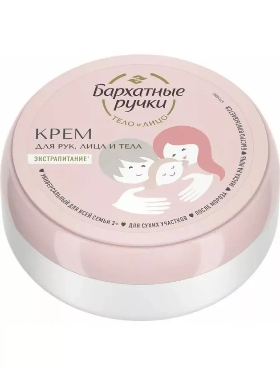 Бархатные ручки, Крем для рук, лица и тела универсальный, 150 мл. В современном мире, где мы постоянно находимся в стрессовых ситуациях и наше тело испытывает различные воздействия, уход за кожей становится все более важным. Бархатные ручки - это идеальный выбор для тех, кто хочет позаботиться о коже рук и тела.Бархатные ручки - это универсальный крем для рук, лица и тела, который обеспечивает полноценное восстановление кожи после воздействия дневных стресс-факторов. Ночной восстанавливающий крем быстро и эффективно устраняет сухость, стянутость и шелушение. Крем интенсивно питает и заботится о коже, на 24 часа избавляя от основных проблем.Его можно использовать для всей семьи от 3-х лет, что делает его идеальным выбором для ухода за кожей всей семьи. Крем легко наносится на кожу легкими массирующими движениями и рекомендуется использовать для детей от 3-х лет.Бархатные ручки - это не только средство ухода за кожей, но и настоящий оазис для расслабления и ухода за собой. С его помощью вы можете получить наслаждение от процесса ухода за своим телом и насладиться его красотой и здоровьем. Попробуйте его сегодня и вы не пожалеете!