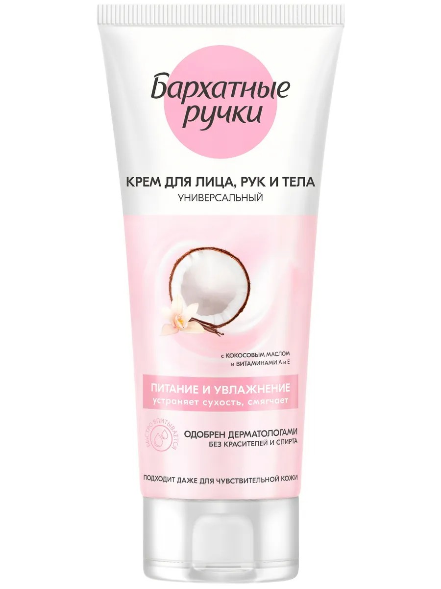 Крем Бархатные ручки для всей семьи для лица, рук и тела, увлажняющий, универсальный, 200 мл Если вам нужен крем, который бы подошел всем членам семьи, включая детей с 3-х лет, попробуйте новинку Бархатные ручки. Универсальный крем разработан специально для ежедневного ухода за кожей лица, тела и рук. Кокосовое масло в его составе увлажняет и питает, устраняет сухость, делая кожу мягкой и гладкой. Витамины А и Е восстанавливают гладкость, тонизируют и придают коже естественное сияние. Витамин Е мощный антиоксидант, поддерживающий собственные защитные функции кожи, а витамин А способствует восстановлению и сохранению упругости и эластичности. Не содержит красителей и спирта. Нежная текстура быстро впитывается, не оставляя ощущения липкости и жирной пленки. Подходит даже для нежной детской кожи. Идеален для применения в любое время дня и в любой сезон. Флакона объемом 430 мл надолго хватит всей семье. Используйте дома, на даче, во время поездок на отдых и будьте уверены, что у вас под рукой есть качественное средство для восстановления и питания кожи. Крем одобрен дерматологами. Откройте для себя все секреты нежности с обновленной коллекцией кремов Бархатные ручки: невероятно притягательные ароматы, различные текстуры от нежных до супернасыщенных и по-прежнему эффективные составы. Доверьте красоту и уход за кожей экспертам бренда Бархатные ручки. Они используют современные технологии и тщательно прорабатывают формулу каждого продукта, чтобы производить действительно эффективную косметику для рук и тела.