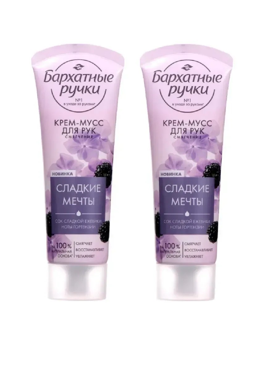 Бархатные Ручки, Крем-мусс для рук Смягчение, 80 мл, 2 шт. Сладкие мечты из новой парфюмированной серии от эксперта №1 в уходе за руками – Бархатные ручки – с манящим ароматом спелых ягод и нотками роскошной гортензии не только сделает ваши ручки вновь ухоженными, но и будет невероятно приятен при нанесении. - Формула на 100% натуральной основе, обогащенной маслами миндаля и ши, а также соком ежевики, решает сразу три задачи: эффективно смягчает, восстанавливает и питает. - Нежная текстура мусса розового цвета прекрасно впитывается, не оставляя липкости и жирности. Для наилучшего результата используйте крем утром, перед выходом на улицу, после каждого контакта с водой, а также на ночь.