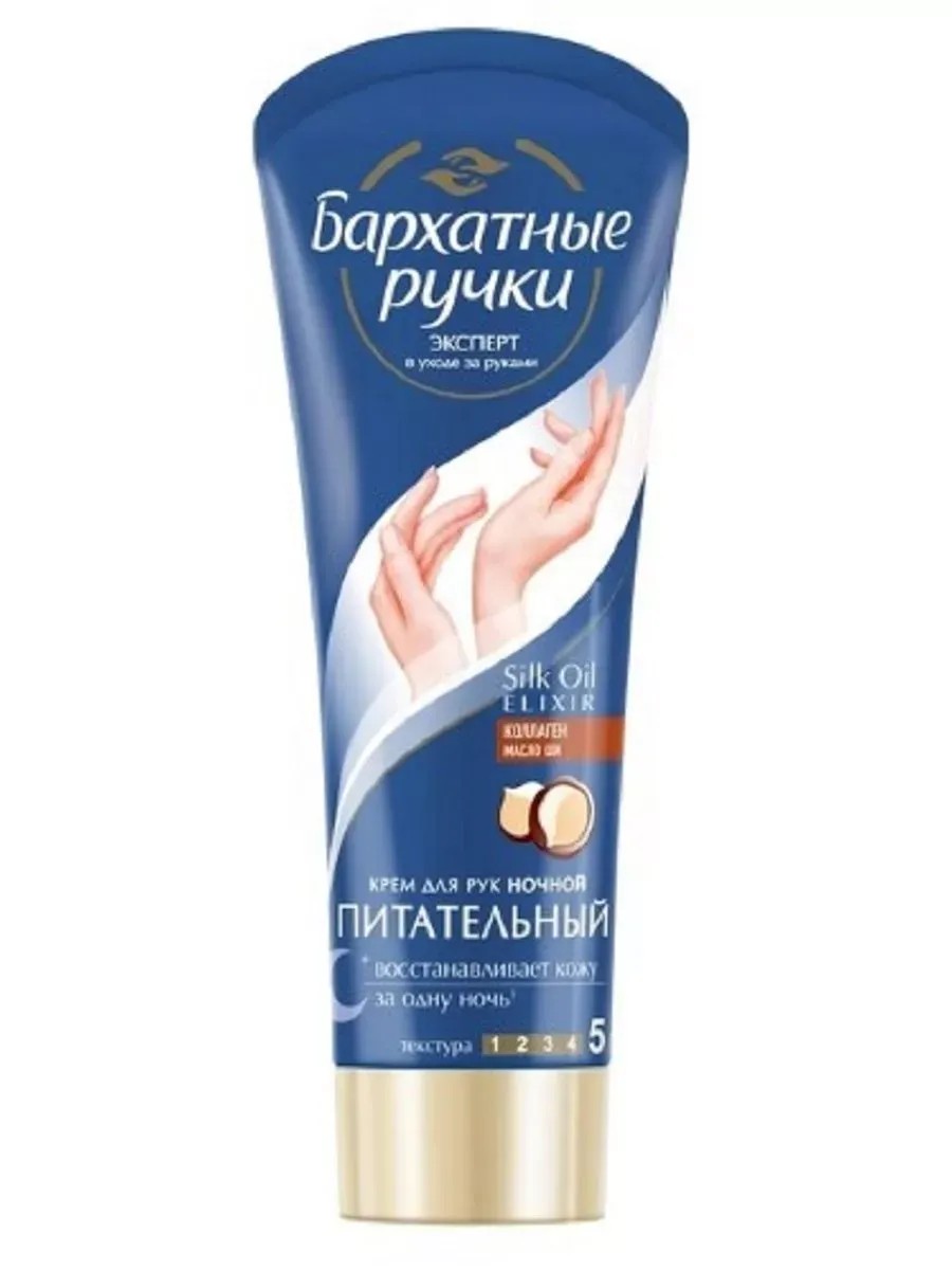 БАРХАТНЫЕ РУЧКИ КРЕМ ВОССТАН Д/РУК НОЧ 80МЛБренд Бархатные ручки - всегда нежная и молодая кожа рук за счет формулы сохранения нежности и молодости.БАРХАТНЫЕ РУЧКИ КРЕМ ВОССТАНАВЛИВАЮЩИЙ ДЛЯ РУК НОЧНОЙ - для всех типов кожиВнешний вид и свойства: Кремовая текстура белого цветаБренд Бархатные Ручки представляет крем для рук НОЧНОЙ ВОССТАНАВЛИВАЮЩИЙ. Ночью для кожи рук восстановление более актуально, чем защита. Ночной восстанавливающий крем для рук Бархатные ручки за 1 ночь обеспечивает полноценное восстановление кожи рук после воздействия дневных стресс-факторов [1]. Действие ночного крема усилено формулой Night Silk Oil Elixir, которая содержит в 5 раз больше насыщенных микромасел*, которые глубоко** проникают в кожу и встраиваются в клетки, восстанавливая их работу. Протеины шелка обволакивают кожу, делая ее нежной.Формула Night Silk Oil Elixir содержит в себе протеин натурального шёлка, который обладает увлажняющими свойствами и способностью образовывать на поверхности кожи дышащую вуаль. После высыхания дарит коже ощущение гладкости, бархатистости.МАСЛО ШИ питает и восстанавливает клетки кожи. Масло ши оказывает смягчающее, увлажняющее и защитное действие. Подходит для ухода за кожей любого типа, особенно за сухой, раздраженной, поврежденной. Масло замедляет старение кожи.Крем имеет ультра насыщенную текстуру, обогащает кожу питательными веществами.[1] Подтверждено потребительским тестированием, 300 человек, min 81% согласившихся, РФ, 2016[2]По результатам собственного аппаратного исследования производителя, действие комплекса дневной крем+ночной крем по сравнению с дневным кремом для рук по параметру увлажнение, 25 женщин, РФ, 2016.*по сравнению с кремом БАРХАТНЫЕ РУЧКИ питательный для рук**в пределах эпидермисаРезультат: кожа рук восстановлена и увлажнена