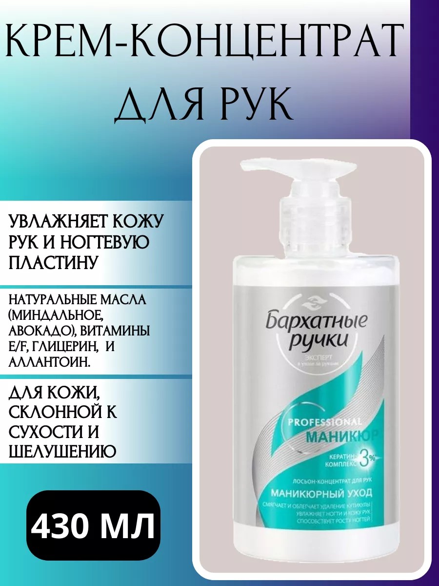 Крем-концентрат для рук Бархатные ручки Маникюрный уход 430 мл. Разработано и рекомендовано профессионалами. Эксперты в уходе за руками разаработали ухаживающий лосьон-концентрат, действие которого идеально подходит для салонной процедуры ухода за руками и ногтями. Он ухаживает за околоногтевой зоной, мгновенно смягчает кутикулу, помогая удалить ее. Формула быстро и полноценно увлажняет кожу рук и ногтевую пластину. Подходит для кожи, склонной к сухости и шелушению. Рекомендован обладателям ломких, склонных к расслоению ногтей. Эмульсионный лосьон, содержит натуральные масла (миндальное, авокадо), витамины Е, F и ухаживающие добавки: глицерин, аллантоин. Способ применения: наносите крем на чистую, сухую кожу легкими массирующими движениями.