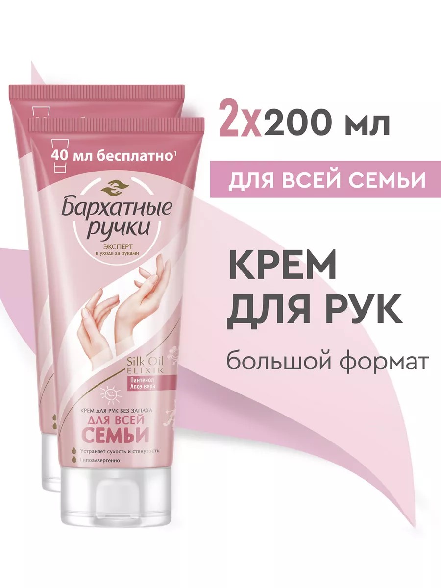 Крем для рук, кутикулы и ногтей «Для меня и моей семьи» Бархатные ручки разработан специально для бережного ухода за чувствительной кожей рук и ежедневного ухода. Комплектация: 2 упаковки в наборе. Подарите коже рук качественную заботу с кремом № 1. Он увлажняет, питает и смягчает кожу, уменьшая шелушение, сухость и признаки раздражения. Благодаря легкой текстуре быстро впитывается, а отсутствие выраженного запаха и красителей обеспечивает комфортное использование для каждого члена семьи. Формула Silk Oil Elixir усиливает действие крема. Микромасла восстанавливают клетки кожи и в комплексе с протеинами шелка делают ее мягкой и нежной. Аллантоин – бесцветное кристаллическое вещество натурального происхождения. Оказывает смягчающее и увлажняющее действие, стимулирует обновление клеток эпидермиса. Витамин Е – основной физиологический антиоксидант рогового слоя кожи. Усиливает действие других витаминов и антиоксидантов, снижает выраженность различных типов раздражения кожи. Масло авокадо замедляет старение кожи и предотвращает появление морщин. Питает, способствует восстановлению защитного, иммунного барьера. Стимулирует выработку организмом коллагена и ускоряет процесс регенерации клеток кожи. В результате применения мягкая и нежная кожа рук. Крем имеет гипоаллергенную формулу, без отдушек. Средство подойдет для женской, мужской и детской кожи. Попробуйте также другие продукты бренда Бархатные ручки и выберите идеальные для себя. Крем в удобном тюбике подойдет в качестве дополнения к подарочному набору косметики.