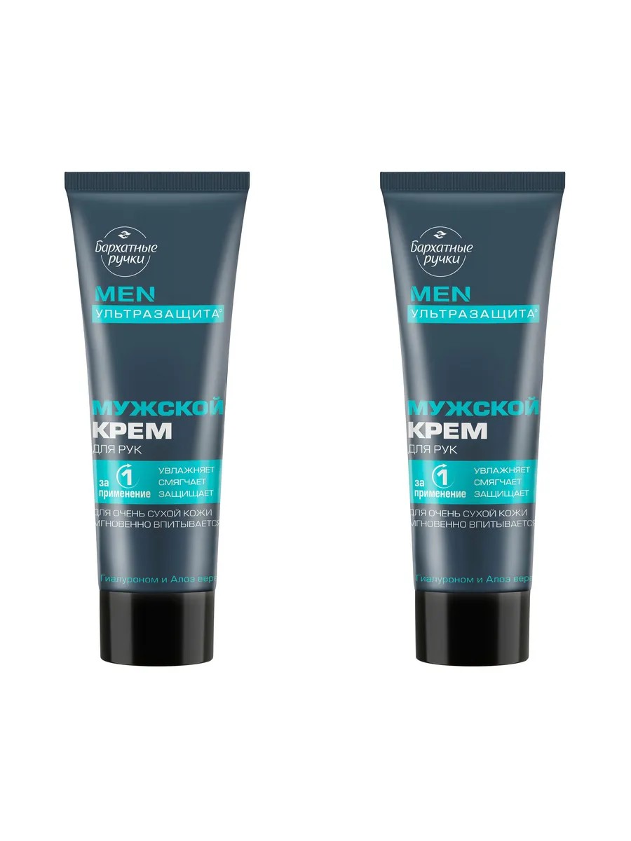 Бархатные Ручки Men Крем для рук мужской Ультразащита, 80 мл, 2 штуки в комплекте. Специально для ухода за мужскими руками эксперты бренда Бархатные ручки разработали - крем Ультразащита. Руки мужчин постоянно в деле: ремонтируют, носят тяжести, зачастую контактируют без перчаток с бытовой химией. Результат: грубая сухая кожа. Мужской крем для рук Бархатные ручки смягчает всего за одно применение, восстанавливает даже очень сухую кожу рук и устраняет шелушение! Активные ингредиенты в составе комплексно воздействуют на кожу. Гиалурон интенсивно увлажняет и создает на поверхности невидимый слой, который помогает контролировать испарение влаги. Алоэ вера смягчает и успокаивает. Масла ши и миндаля разглаживают и питают. Мужской крем Ультразащита мгновенно впитывается, не оставляя жирной пленки. Им удобно пользоваться как дома, так и вне его. Объем 80 мл можно положить в машину или оставить на работе.