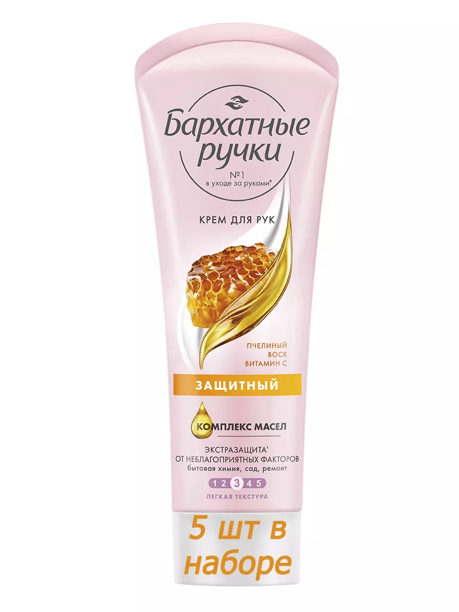 Защитный крем для рук, кутикулы и ногтей с легкой текстурой Бархатные ручки с обновленным дизайном и усиленной формулой. Комплектация: 5 упаковок в наборе. Подарите коже рук качественную заботу с кремом № 1. Собственная защита кожи рук в 20 раз слабее по сравнению с кожей лица. Поэтому крайне важно на регулярной основе защищать кожу рук, в особенности перед проведением хозяйственных работ и при контакте с чистящими средствами. Специально для экстразащиты при воздействии неблагоприятных факторов внешней среды воспользуйтесь Защитным кремом Бархатные ручки. Формула с пчелиным воском и витамином С создает активный защитный барьер, смягчает кожу и усиливает ее естественные защитные функции. Комплекс масел интенсивно увлажняет, смягчает, предотвращает появление сухости. Масло жожоба уменьшает испарение влаги с поверхности эпидермиса. Масло авокадо питает кожу, способствует восстановлению ее защитного барьера. Текстура быстро впитывается, не оставляет липкости и жирной пленки. Результат: кожа рук надежно защищена и смягчена. Дневной крем в удобном тюбике имеет утонченный цветочный аромат с нотами теплой ванили, он доставит особое удовольствие во время нанесения. Парфюмированное средство подойдет для женской и мужской кожи. Доверьте красоту и уход за кожей экспертам бренда Бархатные ручки. Они используют современные технологии, скрупулезно подбирают ингредиенты, тщательно прорабатывают формулу каждого продукта, чтобы производить действительно эффективную косметику для рук и тела. Попробуйте также другие продукты Бархатные ручки и выберите идеальные для себя. Крем подойдет в качестве дополнения к подарочному набору.