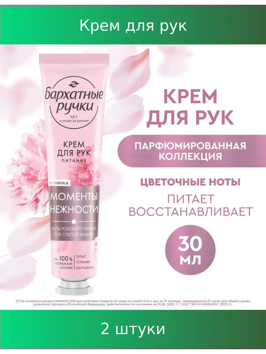 Бархатные Ручки Крем для рук Питание с соком вишни и нотами пиона на 100% натуральной основе, парфюмированный 30 мл. Добавьте в свой уход новинку от эксперта №1 в уходе за руками – бренда Бархатные ручки – парфюмированный крем для рук Питание Моменты нежности. Питательный крем на 100% натуральной основе отлично подойдет для сухой и очень сухой кожи. Текстура крема эффективно питает, устраняет стянутость, защищает от сухости и шелушения, при этом отлично распределяется по коже и быстро впитывается. Почувствуйте роскошный аромат только что сорванных цветов, который раскрывается игривыми цитрусовыми нотками, переходящими в аккорды пиона и ландыша, завершают композицию древесные и мускусные нотки. Не содержит спирта. Подходит для ежедневного применения. Продукт представлен в мини-формате 30 мл, которым удобно пользоваться вне дома. Просто положите его в сумочку и пользуйтесь в течение дня по мере необходимости. Aqua*, Glyceryl Stearate, Coco Caprylate/Caprate, Glycerin, Caprylic/Capric Triglyceride, Zea Mays (Corn) Oil*, Cocos Nucifera (Coconut) Oil*, Prunus Cerasus (Bitter Cherry) Juice*, Acrylates/C10-30 Alkyl Acrylate Crosspolymer, Allantoin, Cetearyl Alcohol, Glycine, Hydroxyacetophenone, Panthenol, Pantolactone, Parfum, PEG-40 Hydrogenated Castor Oil, Phenoxyethanol, Potassium Cetyl Phosphate, Propylene Glycol, Squalane, Triethanolamine, Cinnamyl Alcohol, Citronellol, Limonene, Linalool. *в составе отмечены компоненты 100% натуральной основы.