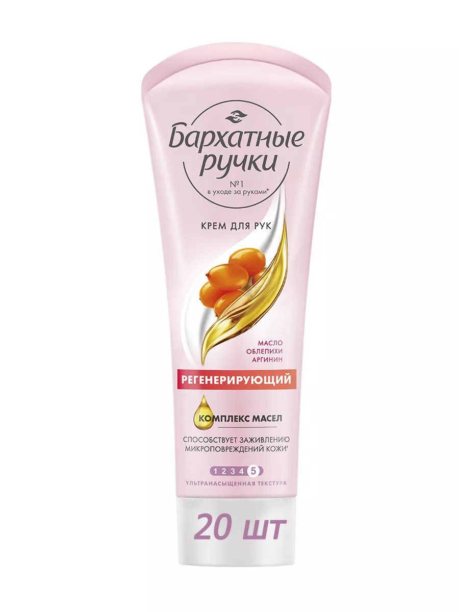 Регенерирующий крем для рук, кутикулы и ногтей с ультранасыщенной текстурой Бархатные ручки с обновленным дизайном и усиленной формулой. Комплектация: 20 упаковок в наборе. Подарите коже рук и кутикулы качественную заботу с Регенерирующим кремом № 1, который эксперты специально создали для интенсивного ухода. Формула косметики с маслом облепихи питает и смягчает кожу, предохраняет от обезвоживания и шелушения. Аргинин увлажняет и стимулирует локальную микроциркуляцию. Аллантоин смягчает роговой слой, способствуя своевременному отшелушиванию отмерших клеток. Масло ши оказывает смягчающее, увлажняющее и питающее действие. Подходит для ухода за кожей любого типа, особенно часто используется для ухода за сухой, раздраженной, поврежденной. Замедляет старение кожи. Комплекс масел интенсивно увлажняет, смягчает, предотвращает появление сухости. Ультранасыщенная текстура быстро впитывается, не оставляет липкости и жирной пленки. Чувственный цветочный аромат с нежными пудровыми нотами подарит особое удовольствие во время использования. Кожа рук ежедневно испытывает колоссальное воздействие разрушающих стресс-факторов. Регулярное применение крема для рук в удобном тюбике, не менее 2 раз в день, восполняет ресурсы кожи, защищая ее от микроповреждений. Парфюмированное средство подойдет для женской и мужской кожи. Используйте днем Регенерирующий крем, а перед сном нанесите Ночной восстанавливающий. Благодаря такому подходу ваши ручки всегда будут выглядеть ухоженно. Попробуйте также другие продукты Бархатные ручки и выберите идеальные для себя. Крем подойдет в качестве дополнения к подарочному набору.