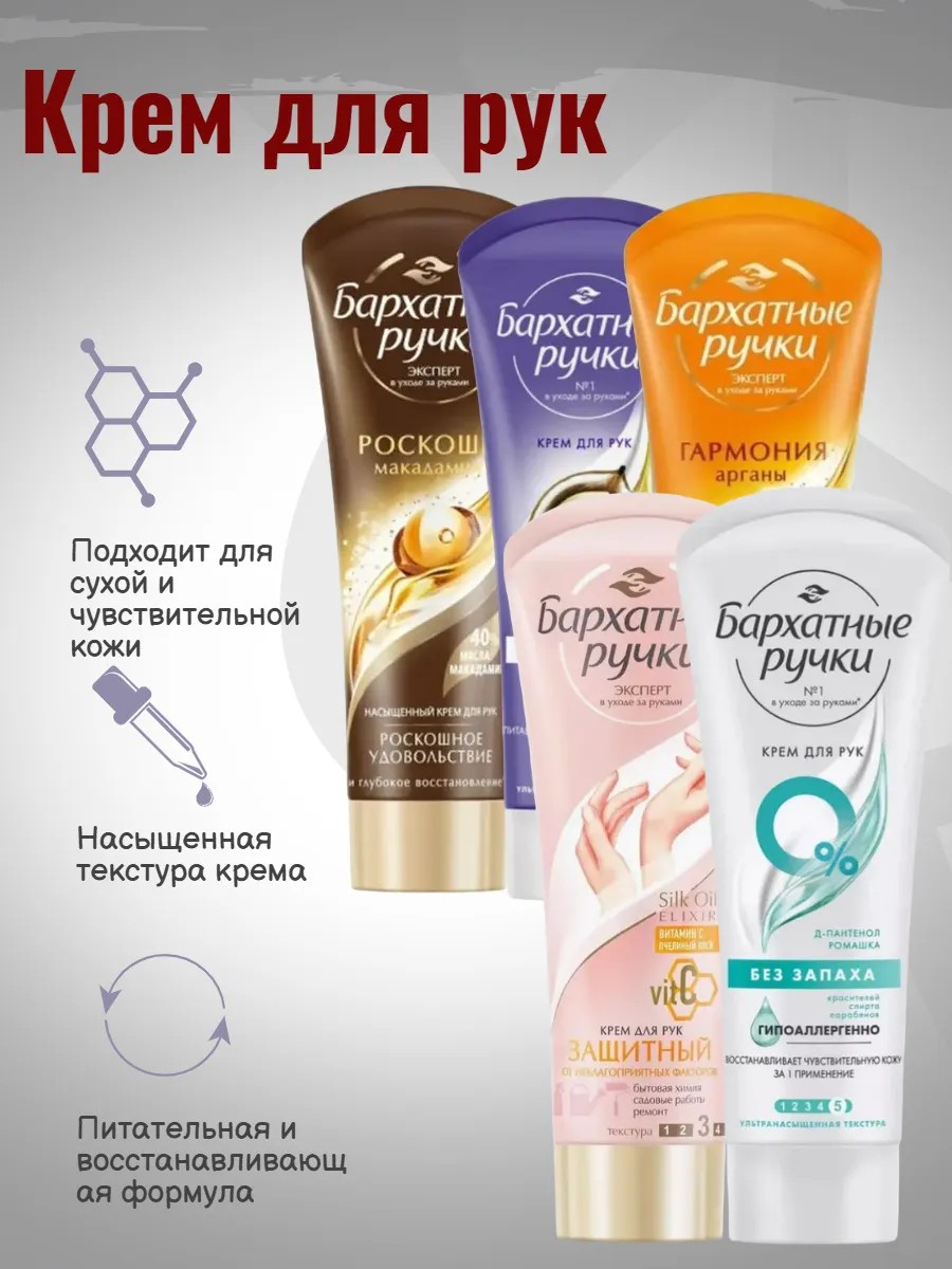 1)Бренд Бархатные Ручки представляет крем для рук БЕЗ ЗАПАХА. Сухая и чувствительная кожа рук требует специального и бережного ухода. Интенсивный крем с формулой Silk Oil Elixir, усиленной пантенолом и ромашкой, разработан специально для быстрого восстановления сухой и чувствительной кожи рук.